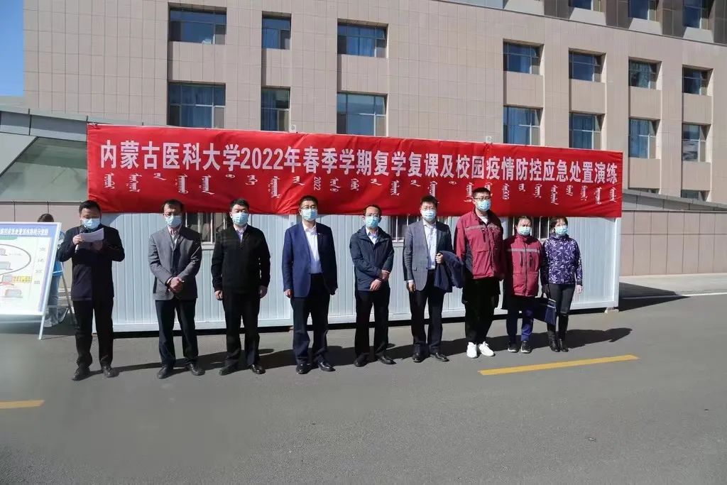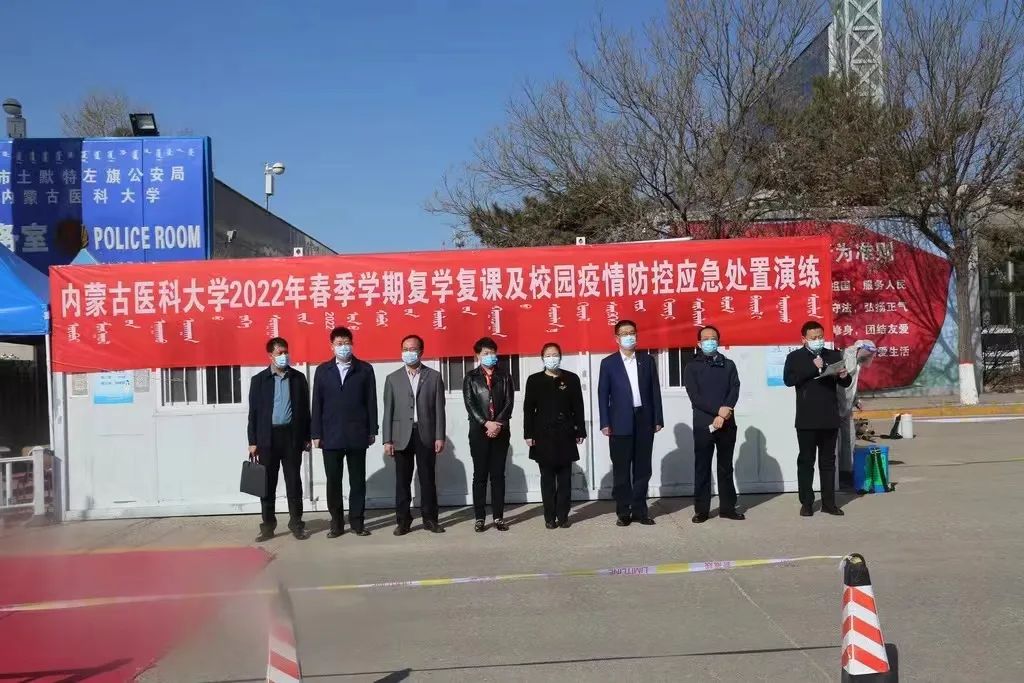 为切实做好2022年春季学期复学复课及疫情防控工作,落实落细各项防控措施,提高防范和应急处置能力,4月6日,学校在金山校区和新华校区分别举行了2022年春季学期复学复课及校园疫情防控应急处置演练。自治区教育厅校外教育培训监管处处长李强,土默特左旗副旗长戈银玲,及土默特左旗、回民区的疫情防控指挥部等有关领导专家全程观摩演练并现场指导。学校党政领导,各职能部门、学院相关负责人,辅导员、班主任、工作人员、志愿者参加了演练。演练活动由学生工作部部长苏雅拉图主持。