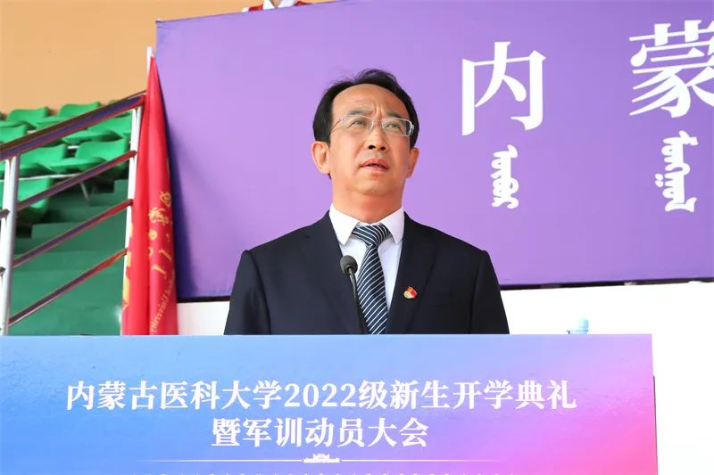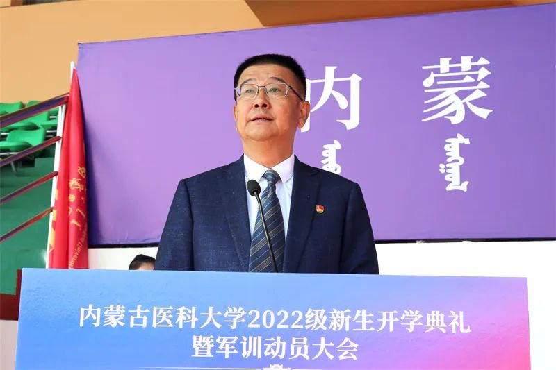 党委副书记、校长赵云山代表学校师生员工祝贺全体新同学加入内蒙古医科大学,向支持、帮助和参与我校军训工作的领导和教官表示衷心的感谢和崇高的敬意。赵云山勉励同学们要砥砺志气、淬炼骨气、牢固底气,以务实的精神开拓前行,以创新的姿态追求卓越,以青年担当继续唱响“强国有我”的时代最强音。他向新生们提出了三点希望:一是要明初心,希望新同学时刻肩负起“健康所系、性命相托”的医学生誓言;二是要勤自勉,希望新同学立志做有专业本领、有道德情操、有朝气活力的内医大人;三是要做顶天立地的时代新人,用大学时光奠定一生进步的根基,书写内医大新篇章。