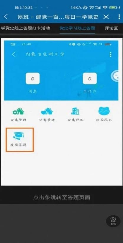 9月23日前,全体学生进入易班app进行评估审核知识答题,学生覆盖率需达到100%,答题结果将反馈至各学院,学院可根据答题结果自行组织筛选决赛代表队。