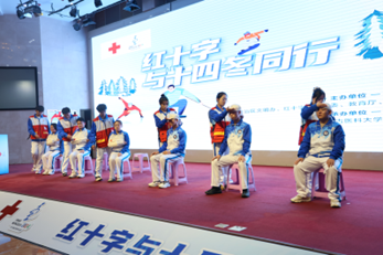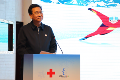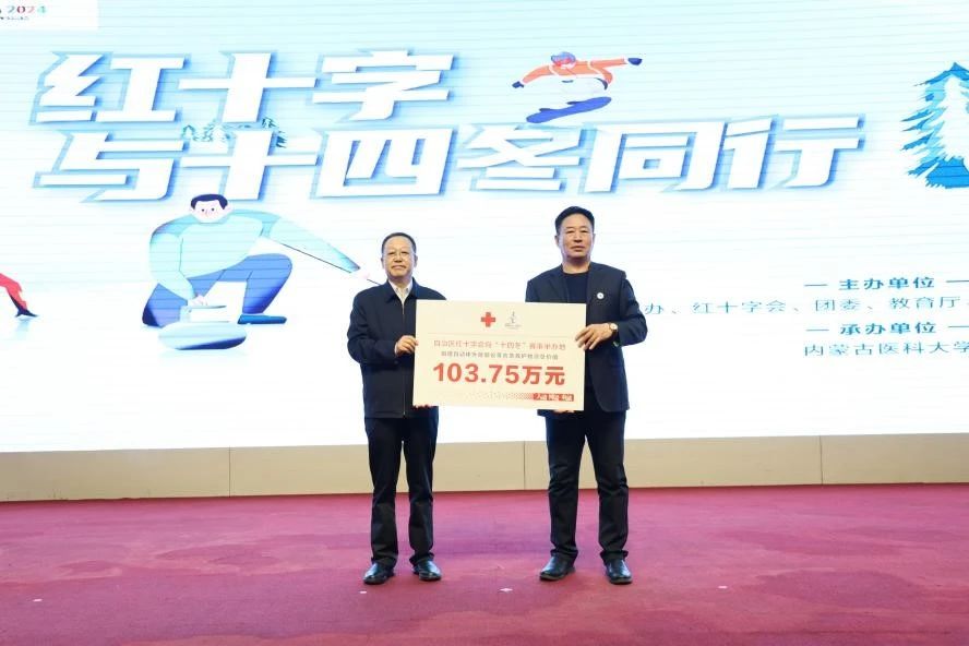 自治区体育局代表赛事组委会接受了向“十四冬”赛区捐赠的应急救护物资,活动现场播放了呼伦贝尔市、赤峰市、乌兰察布市三个赛区红十字会开展志愿服务、应急救护的工作视频。