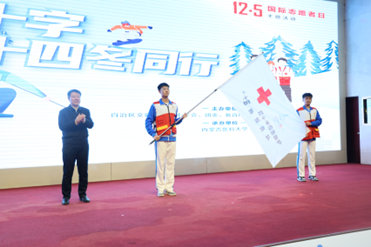 内蒙古自治区副主席、自治区红十字会会长奇巴图为学校“十四冬”红十字应急志愿服务队授旗。