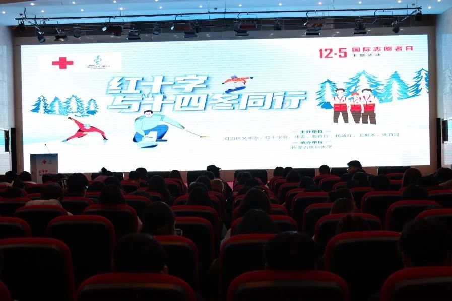 12月5日,第38个国际志愿者日暨“红十字与‘十四冬’同行”主题宣传活动在我校金山校区交流中心多功能厅举行。内蒙古自治区副主席、自治区红十字会会长奇巴图,内蒙古自治区政府办公厅副主任卢颖石,自治区红十字会党组书记、常务副会长杨凤屹,自治区民政厅党组成员、副厅长、一级巡视员、红十字会副会长公维春,自治区纪委监委驻卫健委纪检监察组组长刘建刚,自治区红十字会党组成员、副监事长李鑫,我校党委书记、校长赵云山,党委委员、副校长鲁海文及自治区文明办、红十字会、团委、教育厅、民政厅、卫健委、体育局等单位相关负责人,我校学生及红十字志愿者共200多人参加活动。