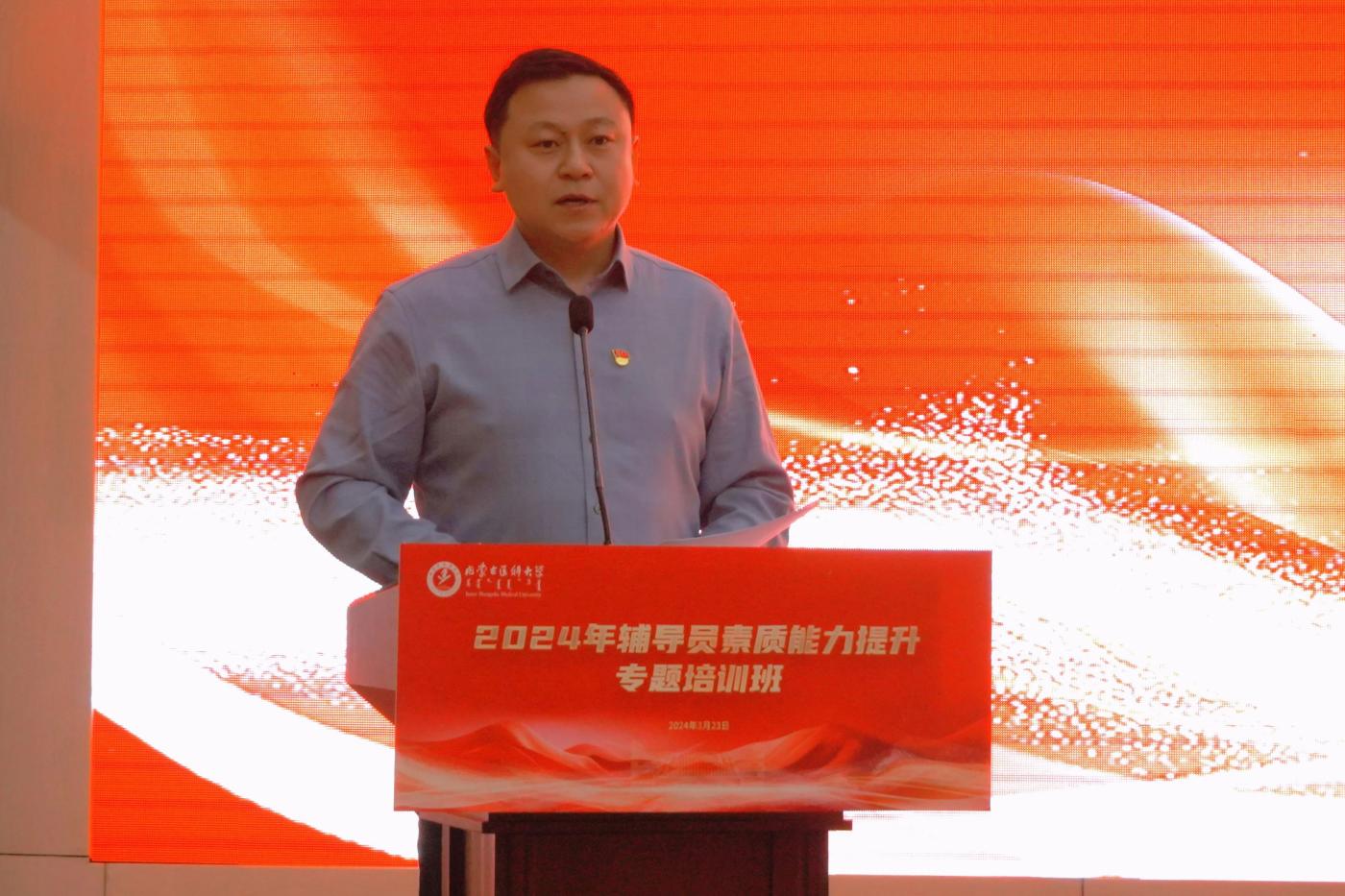 鲁海文副校长讲话,他勉励全体辅导员要进一步凝聚共识,踔厉奋发,不断提高自身素质和能力,要重视学习、乐于学习、善于学习、相互学习,为落实立德树人根本任务,推进“时代新人铸魂工程”,做出新的更大的贡献。
