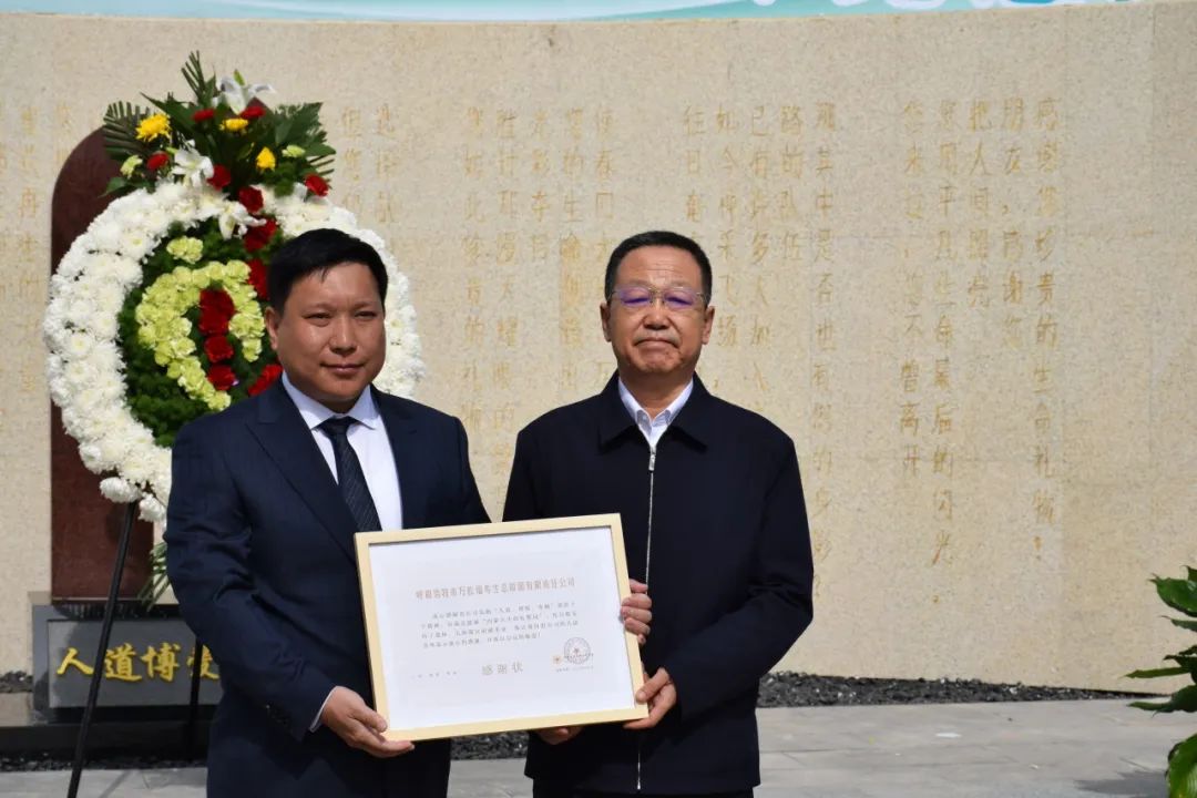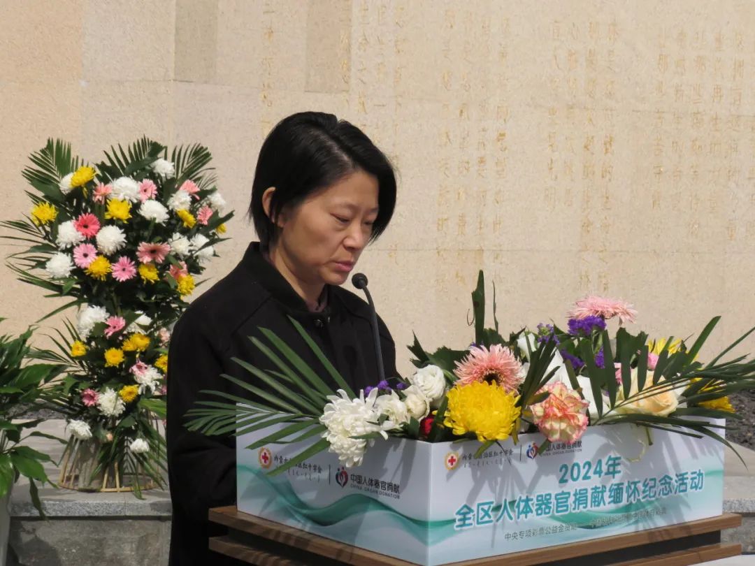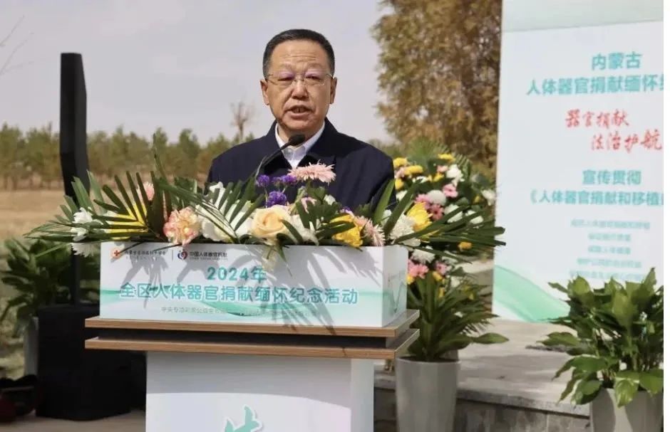 自治区红十字会党组书记、常务副会长杨凤屹代表自治区红十字会致辞,向全区所有遗体和人体器官捐献者家庭、志愿登记者致敬,向援建“内蒙古生命礼赞园”的呼和浩特市万松福寿生态陵园有限责任公司颁授感谢状。