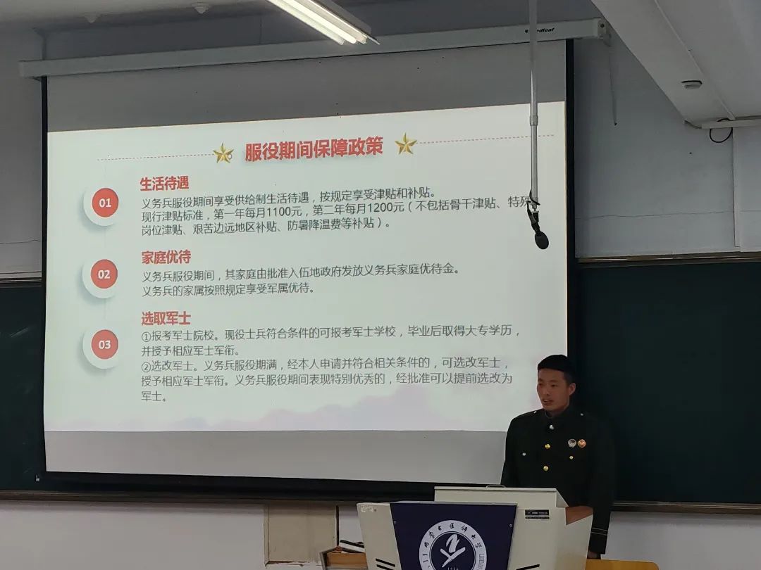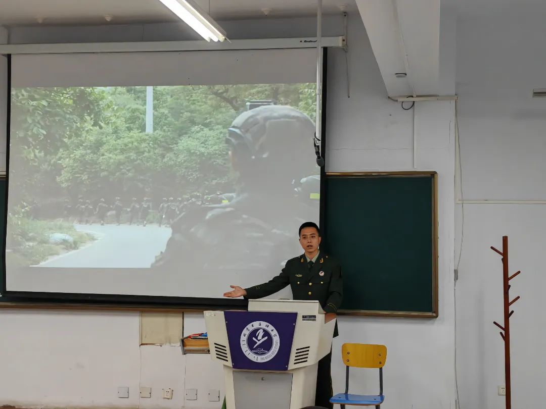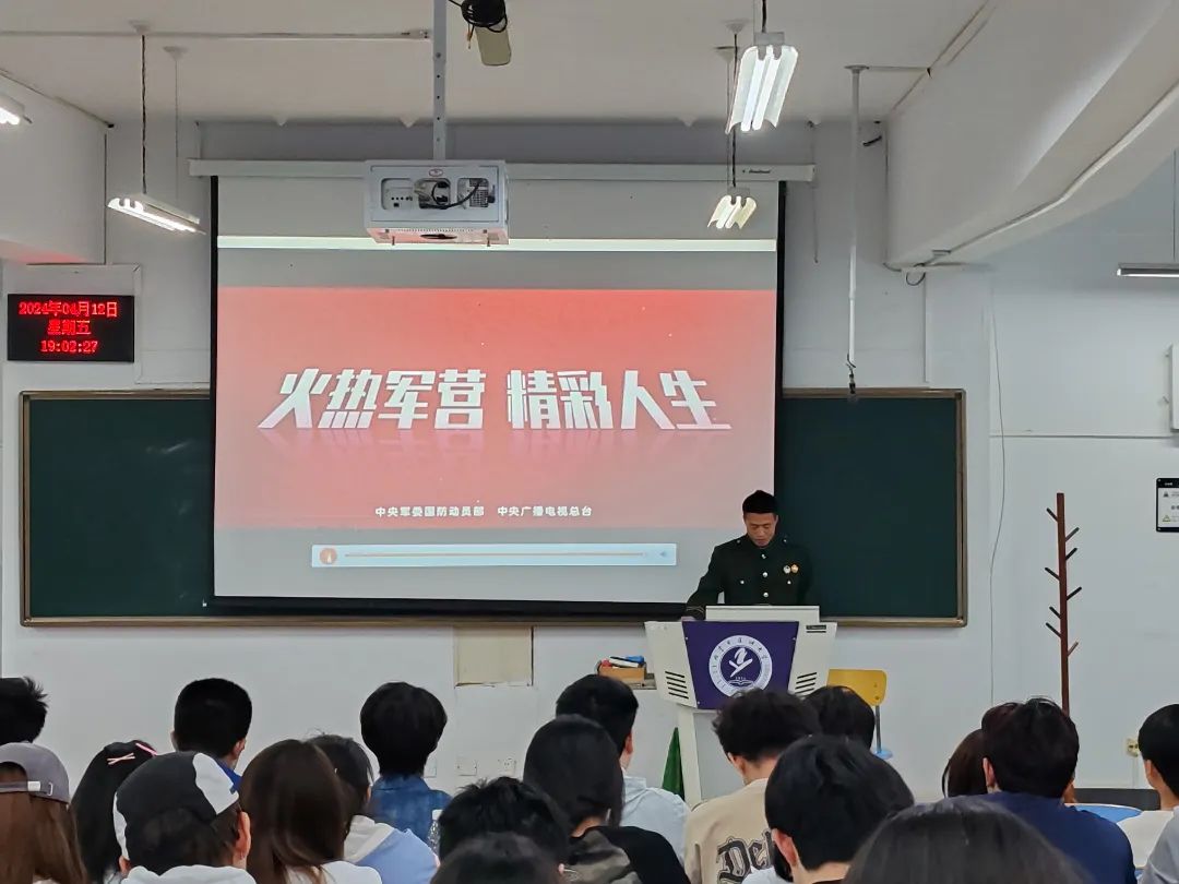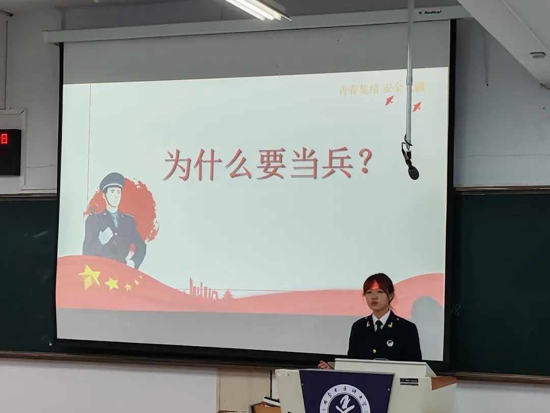 为进一步深化学校国防教育,增强广大学生国防观念,弘扬爱国主义精神,我校于四月份开展了征兵宣传宣讲活动,宣讲团14名同学均为我校退役大学生,他们主动请缨对接各个学院、各个班级开展国防教育和征兵宣讲。从个人军旅生活感悟,参军入伍对于个人的重要意义,入伍的基本条件、流程以及入伍所享受的优待政策等方面进行详细地讲解。呼吁大家勇敢地到军营建功立业,为保家卫国奉献青春和力量。宣讲团成员用朴实真挚的语言、鲜活生动的事例和浓烈深沉的情感,还原了军旅生活的丰富多彩,让同学们对于参军入伍有了更加清晰的了解,点燃了同学们对军营生活的向往。