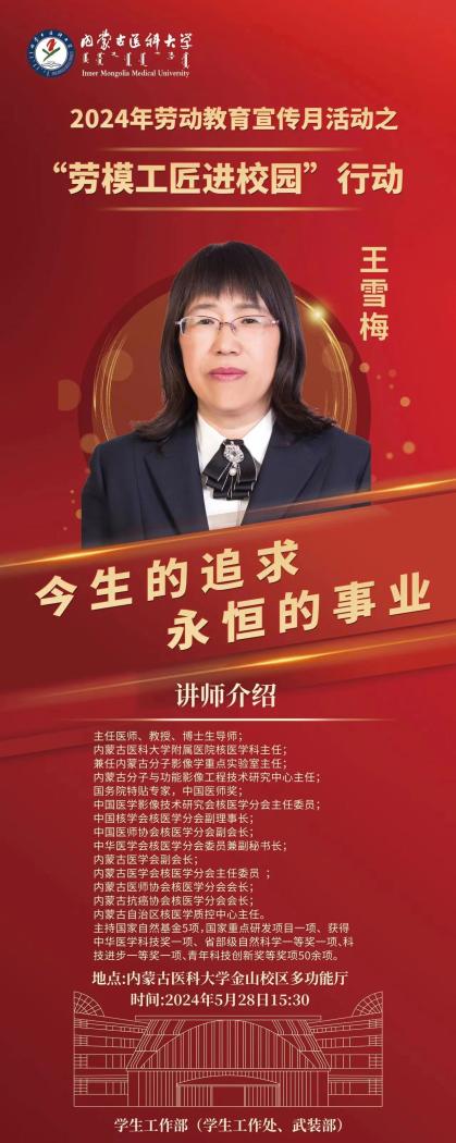 为深入贯彻落实习近平总书记关于大力弘扬劳模精神、劳动精神、工匠精神的重要指示精神,充分发挥劳模工匠在高校中的精神感召和教育榜样作用,学校特组织开展劳动教育宣传月活动之“劳模工匠进校园”行动。5月28日,学校邀请全国五一巾帼标兵、内蒙古自治区五一劳动奖章获得者王雪梅同志为广大师生作第三场讲座。学生工作部(学生工作处、武装部)相关负责人及师生代表共200余人聆听了讲座。