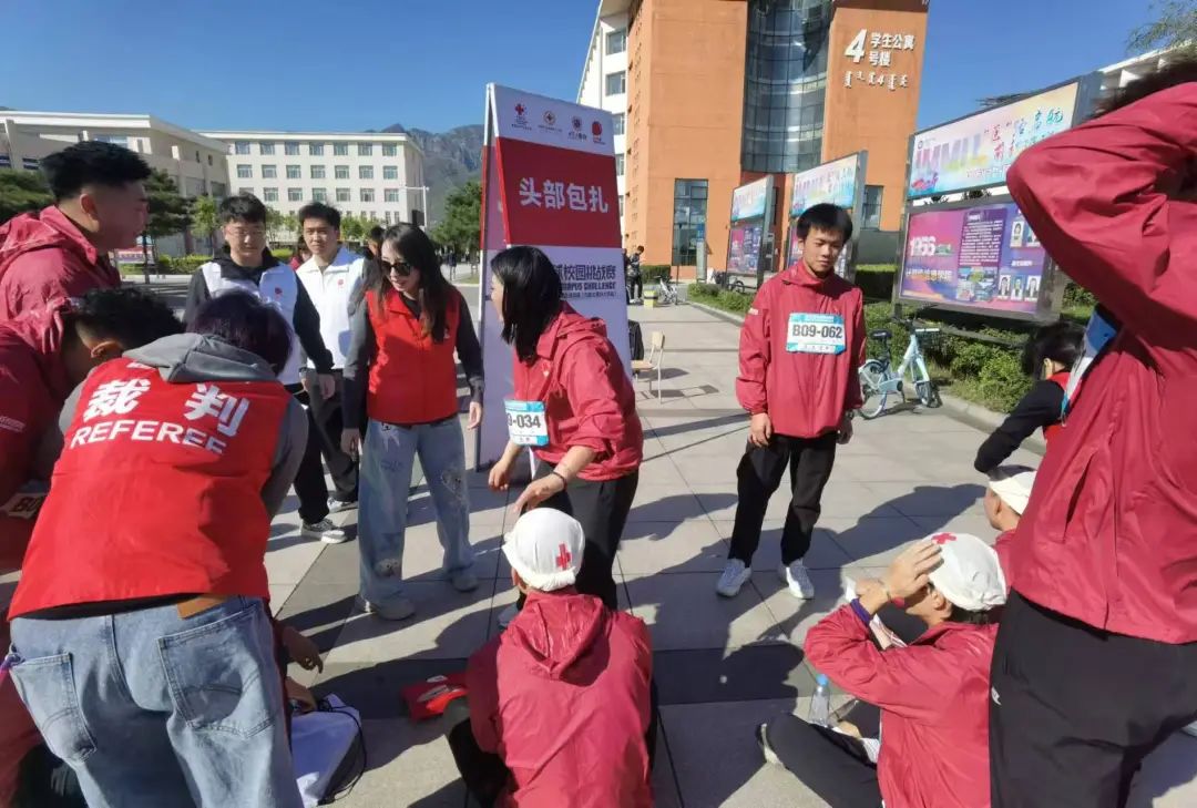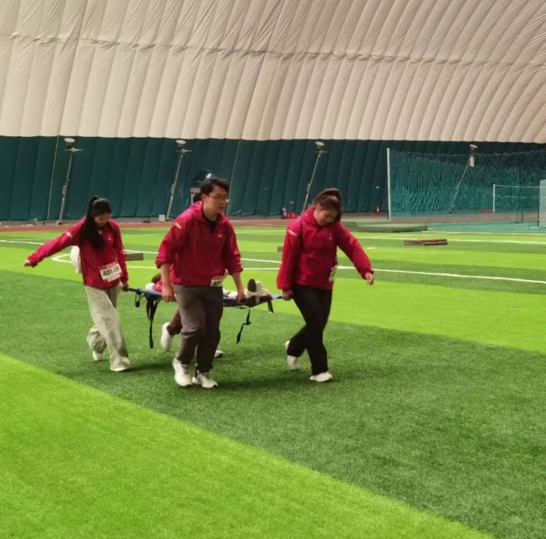 比赛中,各组成员配合默契,充分展示了团队协作的力量,不仅增强了同学之间的友谊与信任,更提升了团队的凝聚力。110名裁判员分布在各个打卡点中,以严谨、认真的敬业精神确保比赛公平公正,并指导参赛者掌握正确的应急救护知识技能。