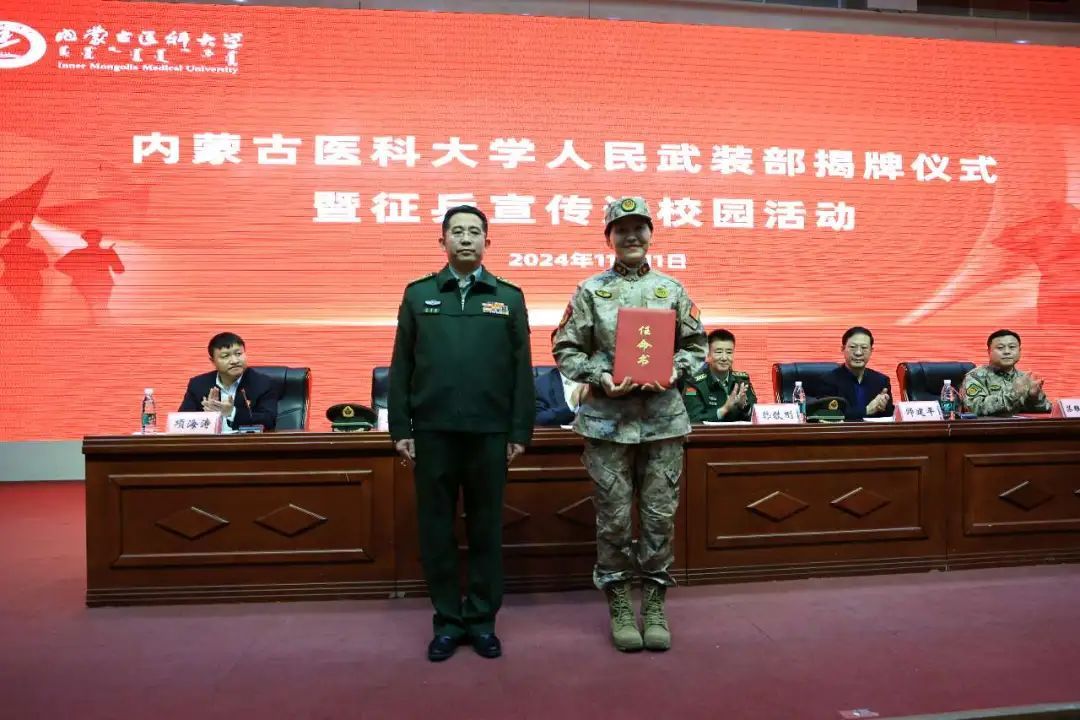 丰志敏部长宣读《关于在内蒙古医科大学设立人民武装部的批复》和《内蒙古医科大学人民武装部部长、干事任职命令》,并颁发任命书。