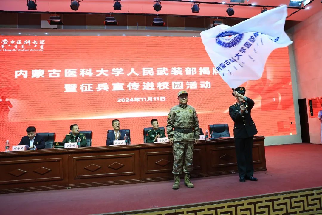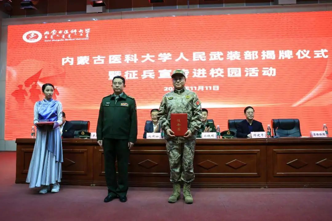 11月11日,内蒙古医科大学人民武装部揭牌仪式暨征兵宣传进校园活动在金山校区举行。呼和浩特警备区战备建设处处长韩铁刚,呼和浩特市回民区人武部上校部长丰志敏,学校党委书记、校长赵云山,党委委员、副校长师建平,党委委员、组织部部长项海涛,学生工作部、安全管理部、团委、教务处、招生就业处负责人及各学院分管学生工作负责人,全体辅导员、学生代表参加了活动,活动由项海涛部长主持。