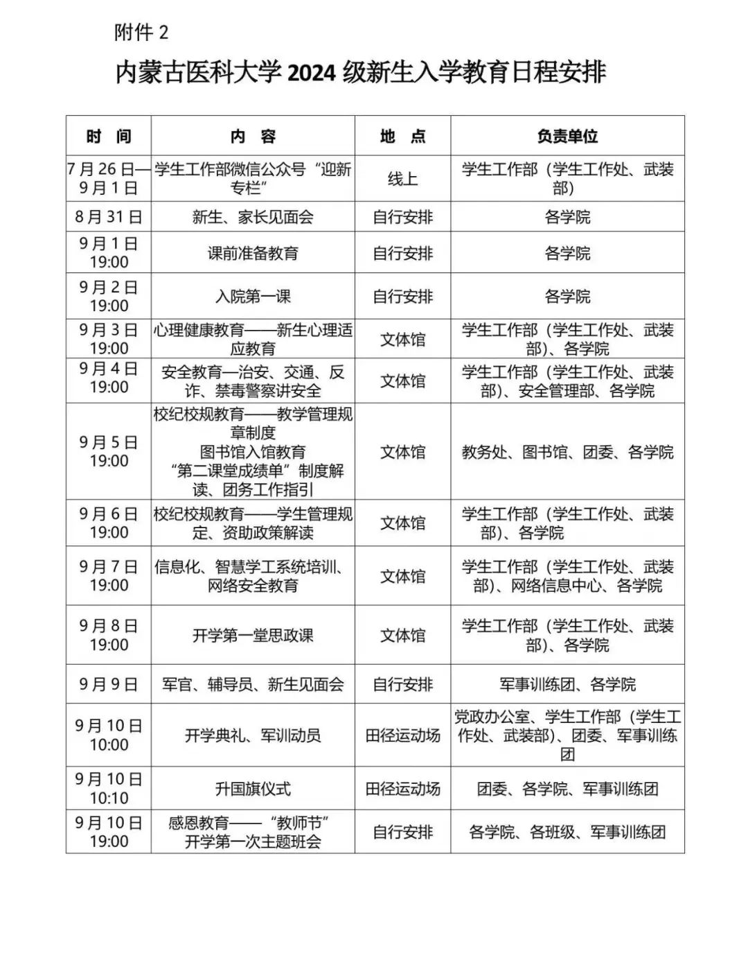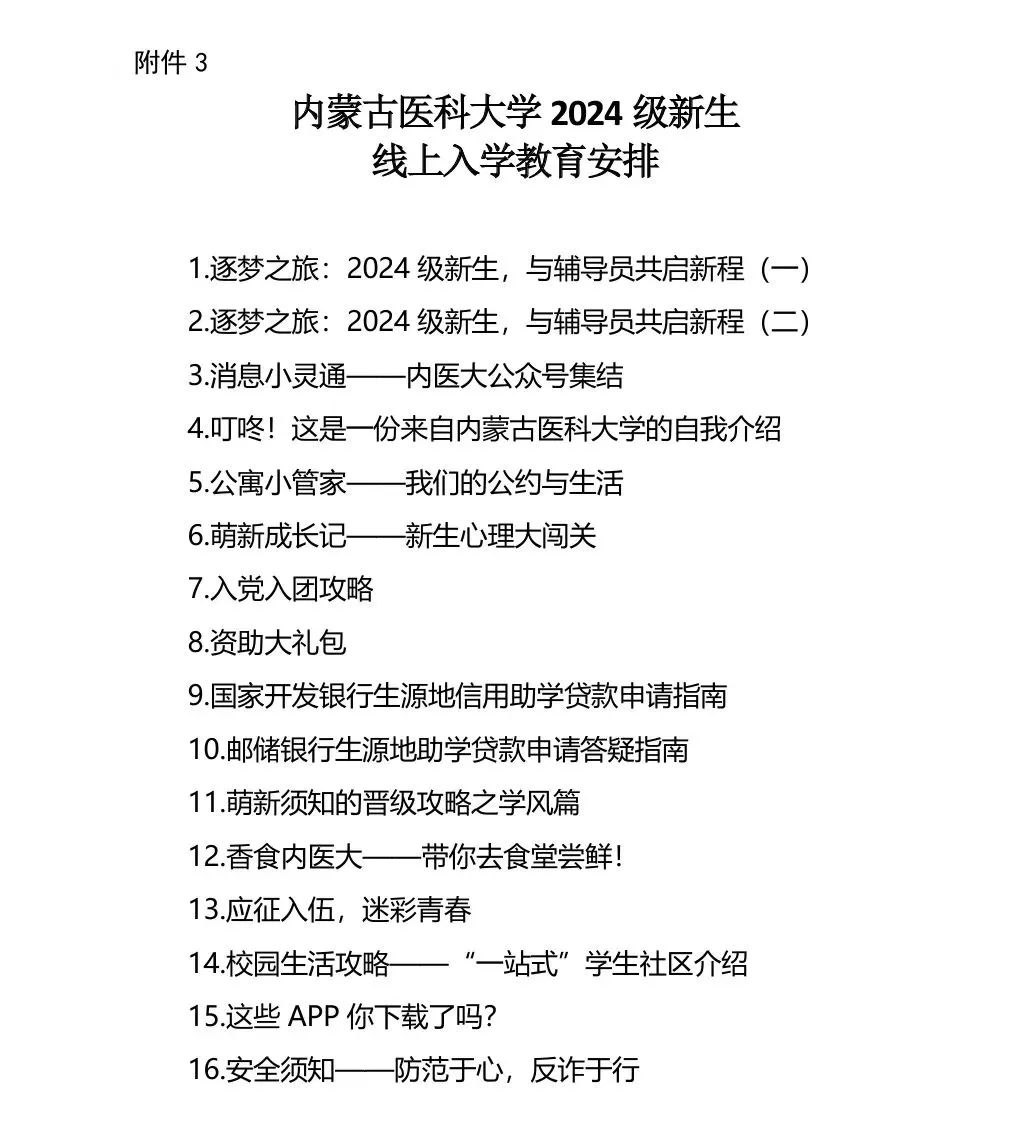 各学院要重点围绕遵规守纪、诚实守信、文明修身等内容,面向新生开展行为规范教育。广泛开展主题宣讲、主题班团会,大力弘扬崇尚劳动、尊师重教、诚信感恩的优良传统,引导新生遵纪守法、提升品德、文明修身。同时,各学院要组织新生认真学习《内蒙古医科大学学生手册(2024年版)》,重点学习《内蒙古医科大学学生违纪处分办法》(内医校发〔2023〕57号)、《内蒙古医科大学学生公寓管理办法》(内医校发〔2022〕52号)、《内蒙古医科大学学生学籍管理规定》(内医校发〔2017〕84号)、《内蒙古医科大学本专科学生素质测评办法》(内医校发〔2022〕54号)以及资助政策等内容,增强学生规则意识,引导学生明理、守信,促进良好校风、学风养成。