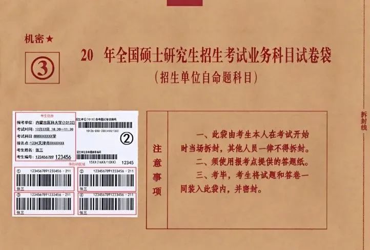 内蒙古医科大学2025年自命题科目将随信封为每位考生提供四张条形码,考生拿到自命题试题信封后,请认真核对信封上条形码的个人信息,包括报考单位、报考点、考生编号、考生姓名、考试科目等。