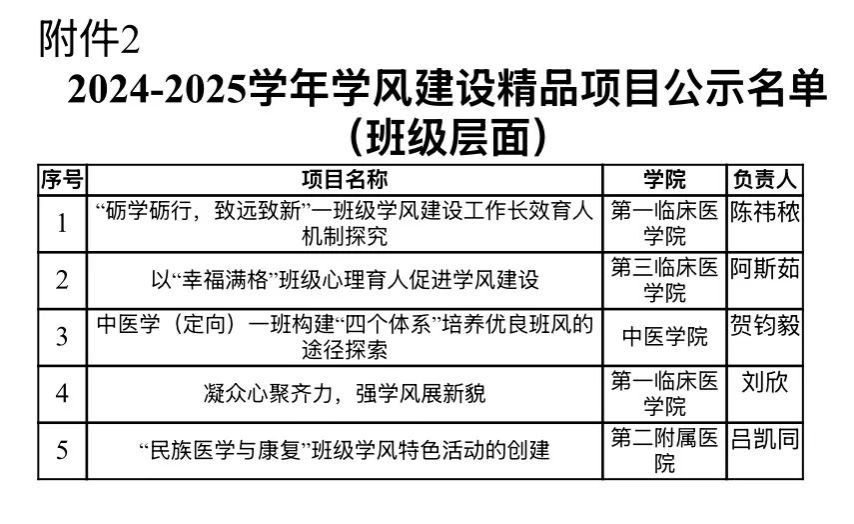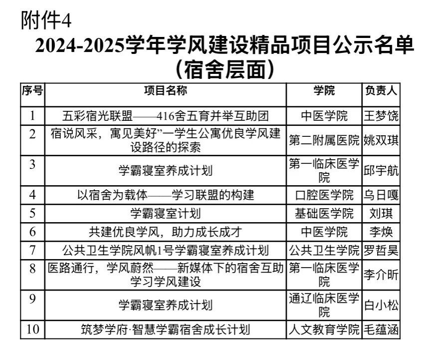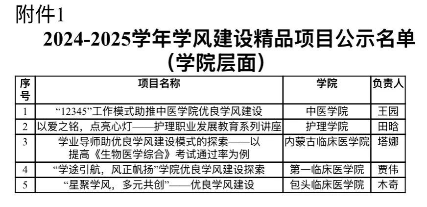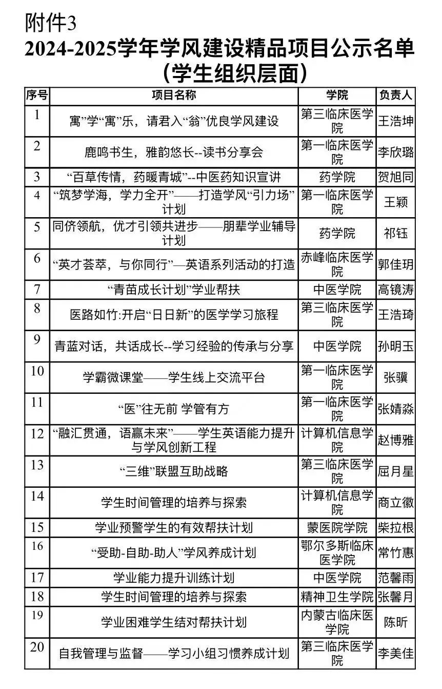 根据《关于开展内蒙古医科大学2024-2025学年学风建设精品项目申报的通知》(内医学工发[2024 ]62号)要求,经专家评审共评出学风建设精品项目40项(学院层面5项、班级层面5项、学生组织层面20项、宿舍层面10项),现将结果予以公示。公示期为2025年3月10日至3月15日,公示期间,如有异议,请与学生工作部学业指导与发展中心处联系。