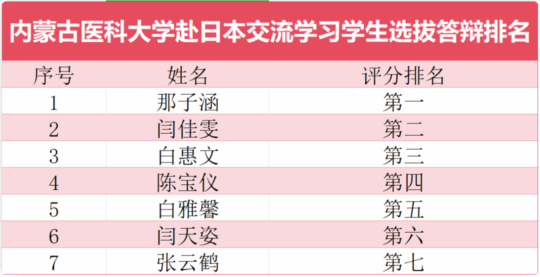 根据《关于选拔临床医学专业优秀学生代表赴日本富山大学进行临床交流实践的通知》(内医学工发〔2025〕11号)等文件精神,经学生申报、学院推荐、学生工作部(处)审核、现场答辩。现将选拔结果排名予以公示(见附件),公示期为3个工作日(2025年3月19日至3月21日)。