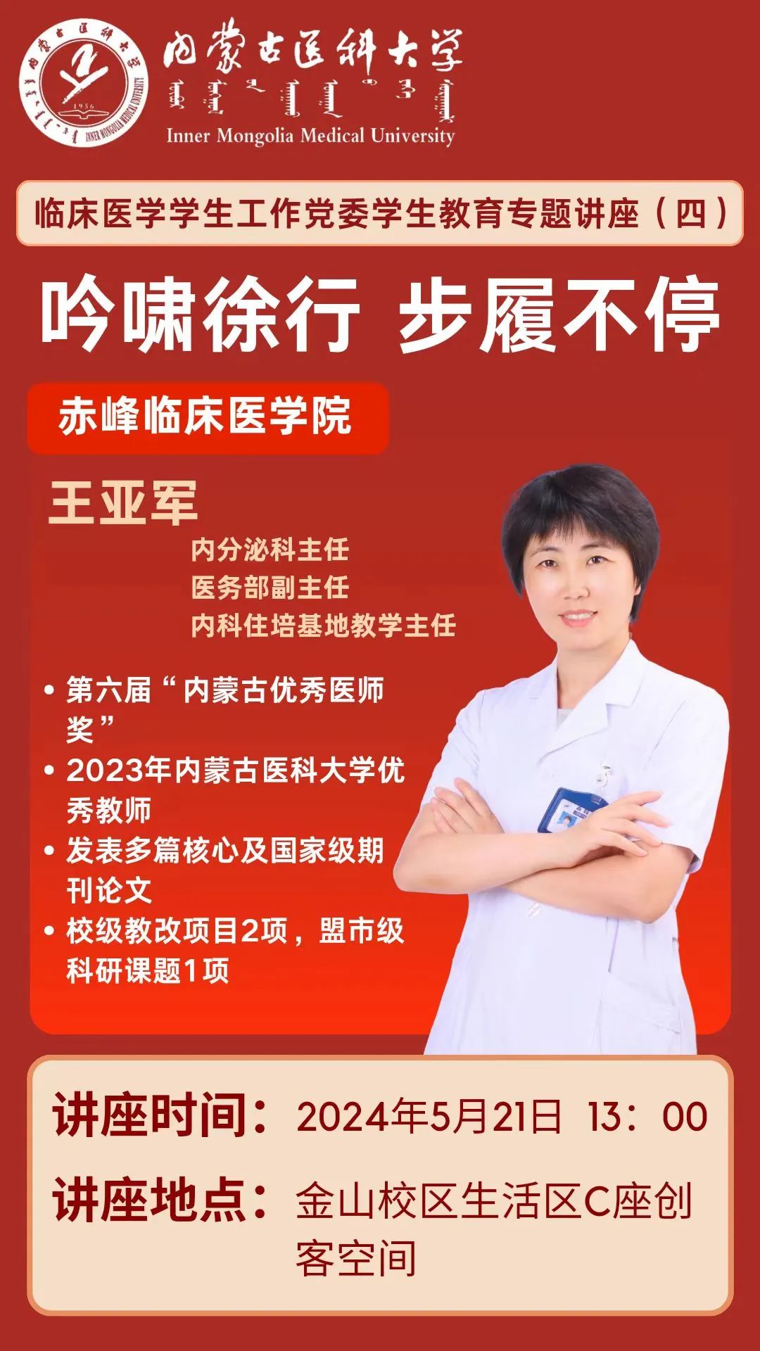 为进一步加强学校学风建设,提高同学们对所学专业及行业的认识,科学规划大学的学习生活和努力方向。按照临床医学学生工作党委有关安排。5月20日,赤峰市医院王亚军主任莅临我校开展题为“吟啸徐行,步履不停”的专题讲座。本次讲座由临床医学学生工作党委副书记张光旭主持。