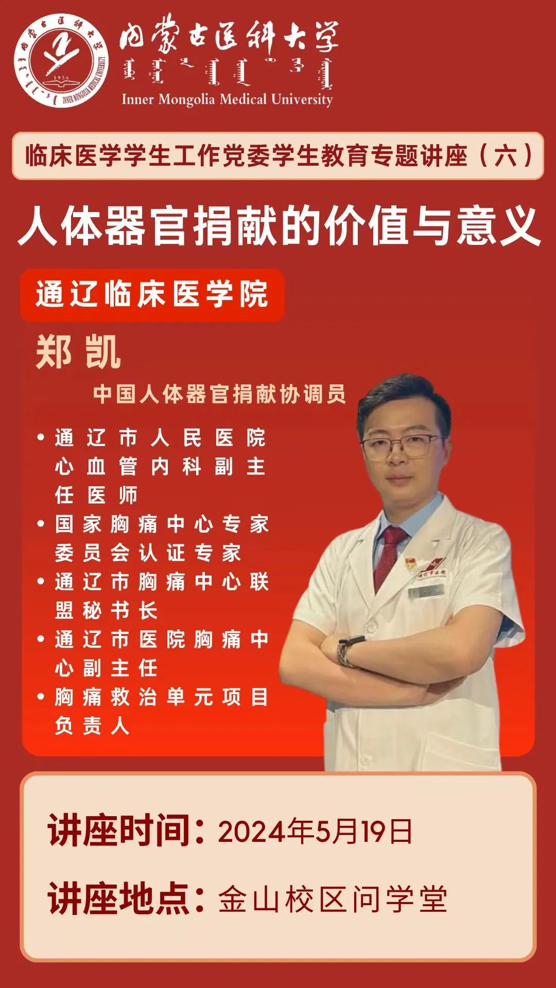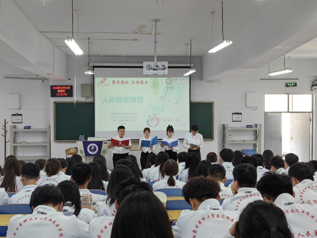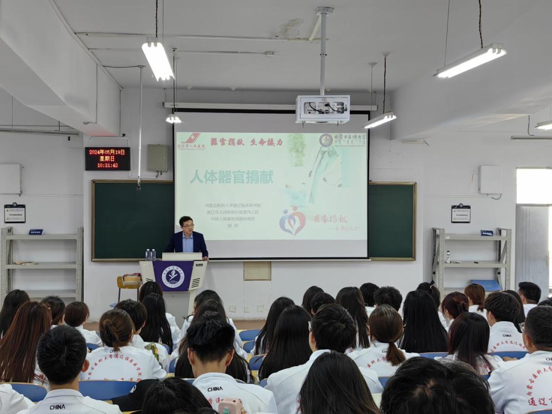 为提升学生对器官捐献的认识并激发社会责任感,按照临床医学学生工作党委有关安排,5月19日,有幸邀请到了通辽市医院的中国人体器官捐献协调员郑凯老师莅临我校开展“生命接力”器官捐献科普讲座。