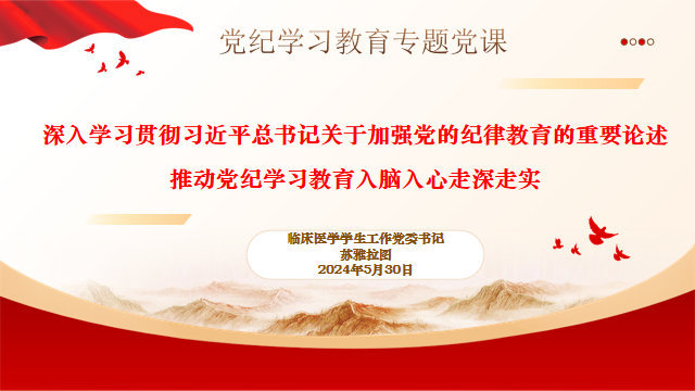 近日,临床医学学生工作党委书记苏雅拉图以“深入学习贯彻习近平总书记关于加强党的纪律教育的重要论述 推动党纪学习教育入脑入心走深走实”为题,在金山校区辅导员发展中心为党支部书记、教职工党员讲授党纪学习教育专题党课。