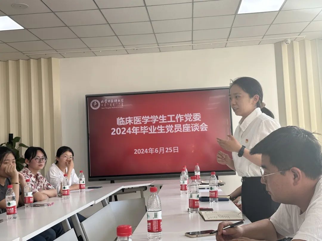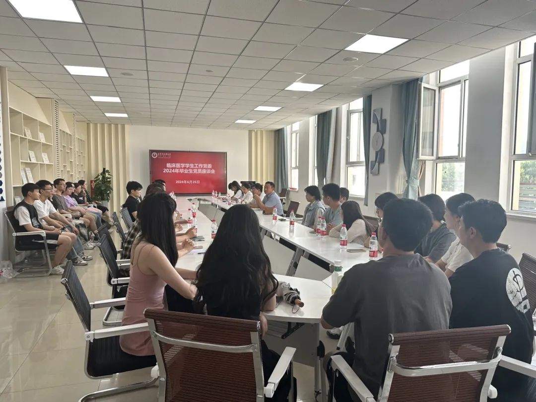 近日,临床医学学生工作党委2024届毕业生党员代表座谈会在生活区B座辅导员之家召开,党委书记苏雅拉图出席会议,来自各临床医学院的46名毕业生党员参会。