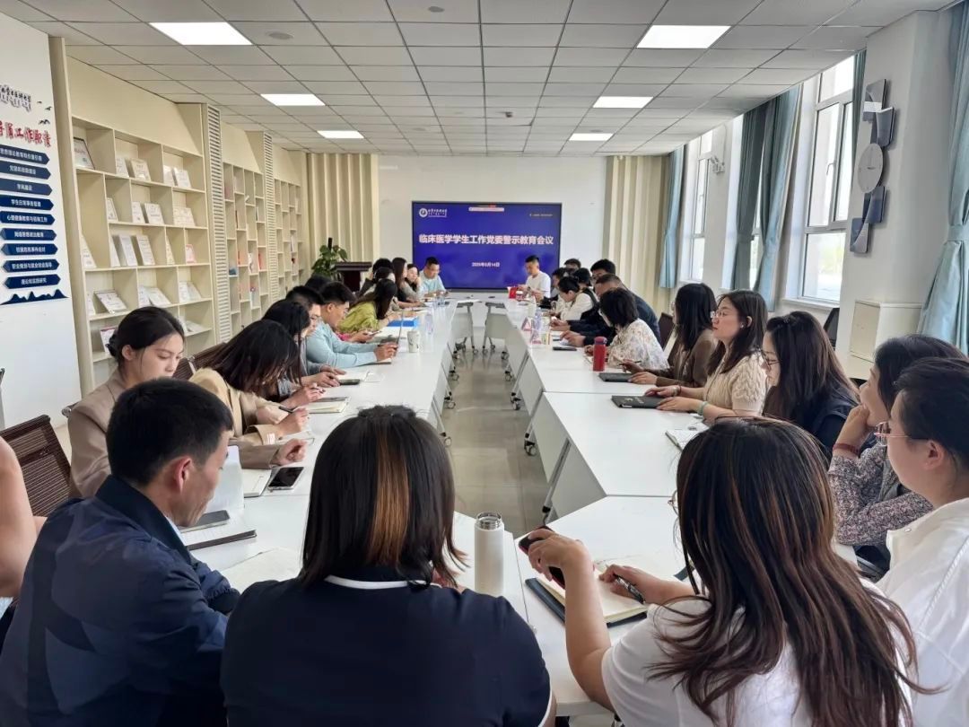 2025年5月14日下午,临床医学学生工作党委在金山校区辅导员发展中心开展警示教育会议和全面从严治党工作会议。党委委员、各党支部书记、全体教职工党员参加会议。会议由临床医学学生工作党委副书记毛永强主持。