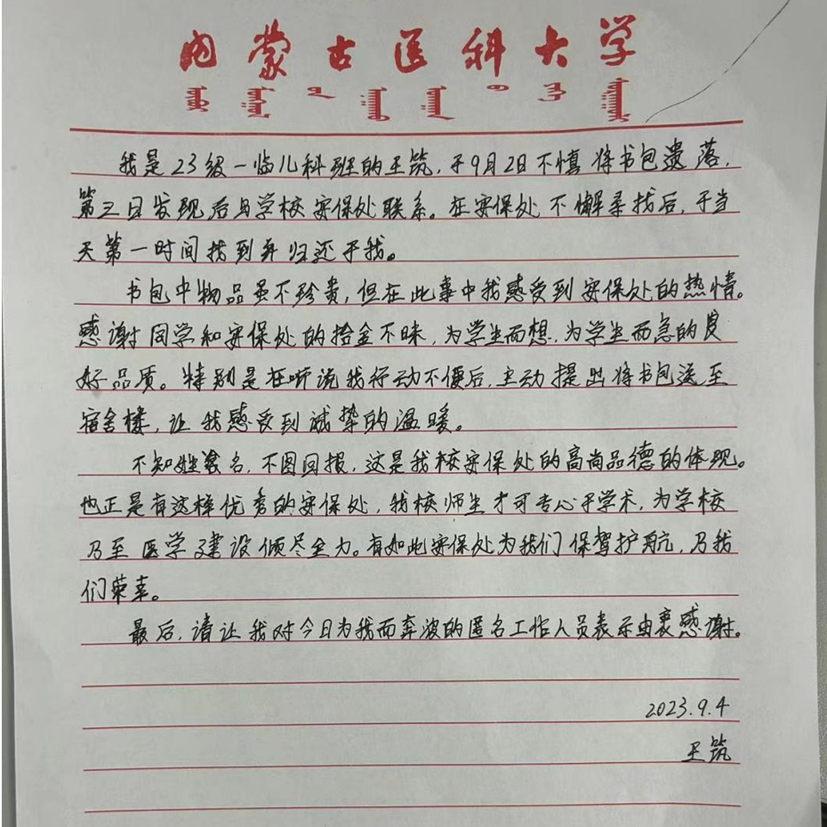 9月4日,安全管理部收到一封来自2023级新生的手写感谢信,信中感谢了安全管理部保安帮助自己寻回遗失物品的暖心行为。事情发生在9月2日,该同学不慎将自己的书包遗落,事发第三日才想起找寻,经过保安人员的不懈努力,遗失物品被找回并送至学生所在宿舍楼。在此提醒同学们,校园生活要妥善保管好自己的财物,尤其是贵重物品。