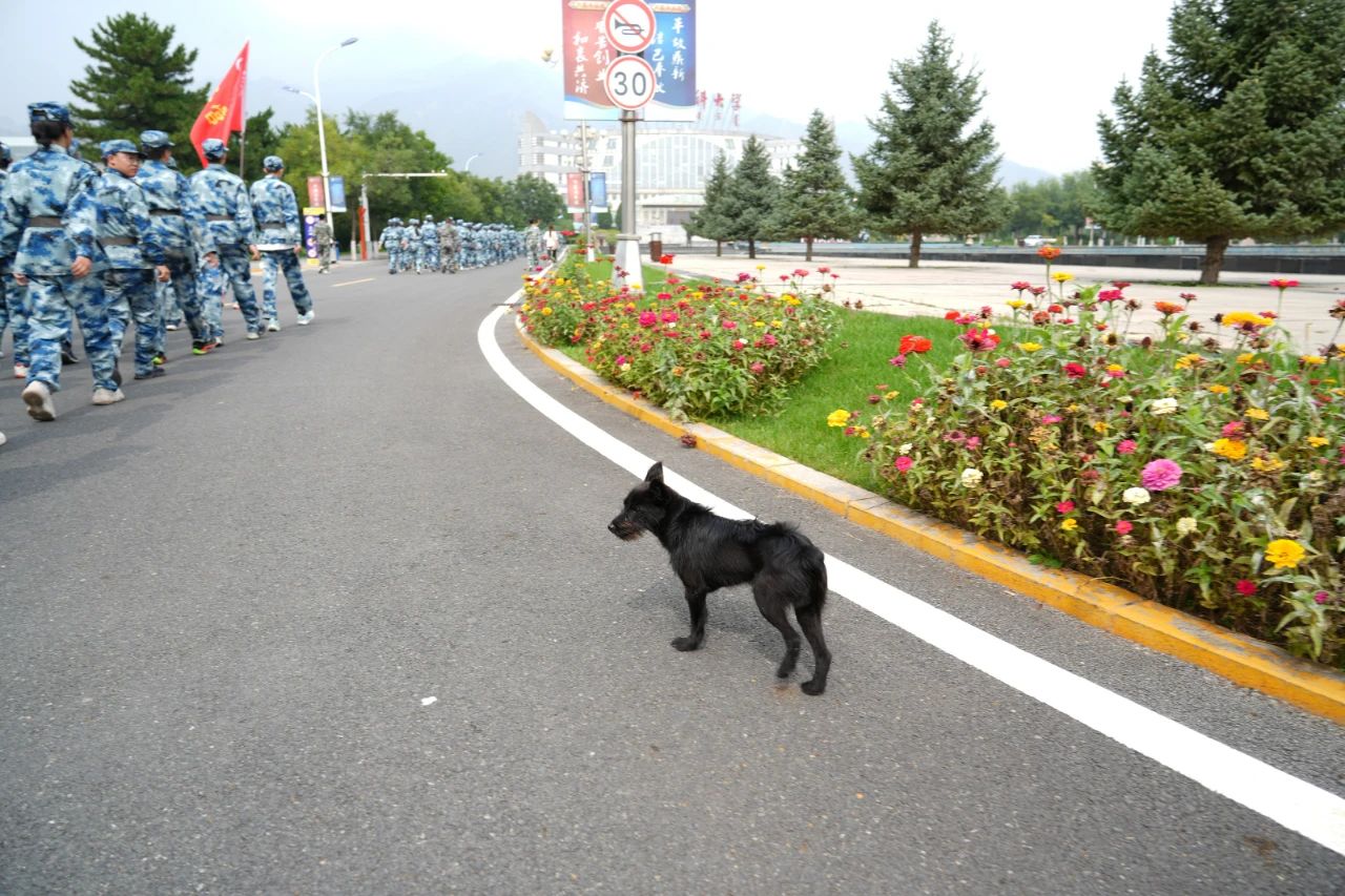 在晨光的照耀下,新生们身着统一服装,排成整齐队伍,开始了他们的拉练之旅。小黑“学长”紧跟队伍,一直奔跑在最前方,好像在说:“跟上我,我们一起前进!”它的活力感染了每一个人,大家的步伐变得更加轻快。