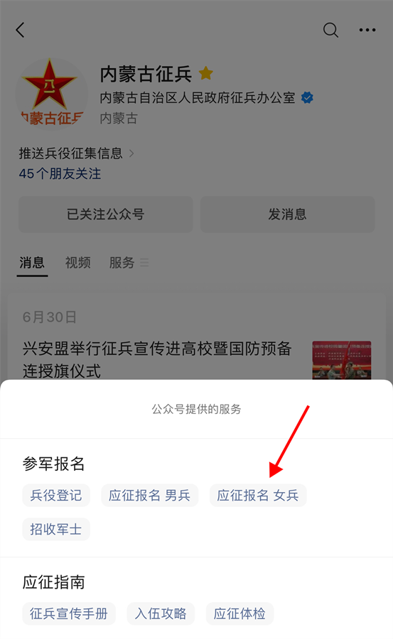 手机关注“内蒙古征兵”微信公众号识别二维码,进入全国征兵网报名↓↓