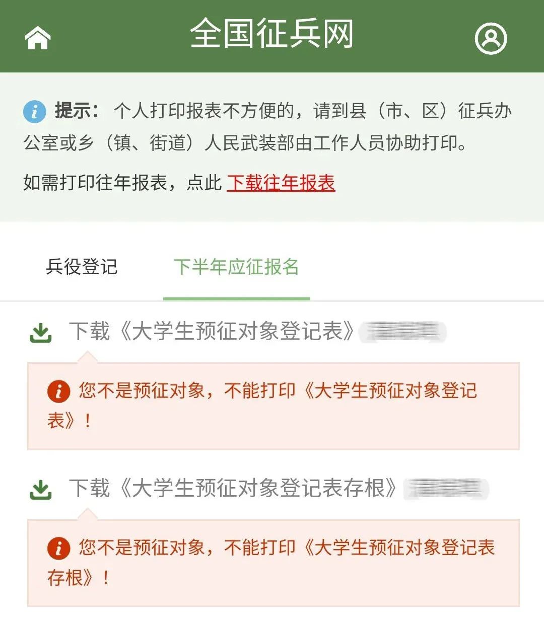 要办理《大学生预征对象登记表》,首先要自己下载、打印、填写《大学生预征对象登记表》。因为应征报名刚刚开始,在下载《大学生预征对象登记表》时,有可能会遇到网上提示“您不是预征对象,不能打印《大学生预征对象登记表》”。不是预征对象网上就不会生成《大学生预征对象登记表》,如下图: