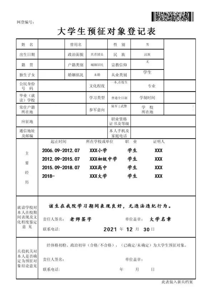 在生源地应征报名的大学生,无论是全日制还是非全日制大学,不管以后体检和政治考核结果如何,放假前在学校期间请一定办理好《大学生预征对象登记表》,否则体检和政治考核结束后正是放假时间,交表时找学校盖章很难。02办理方法