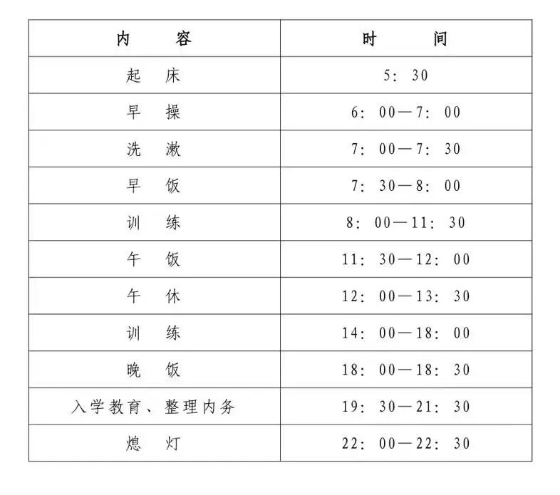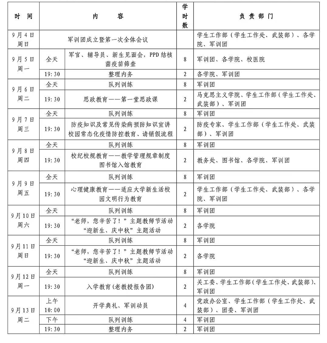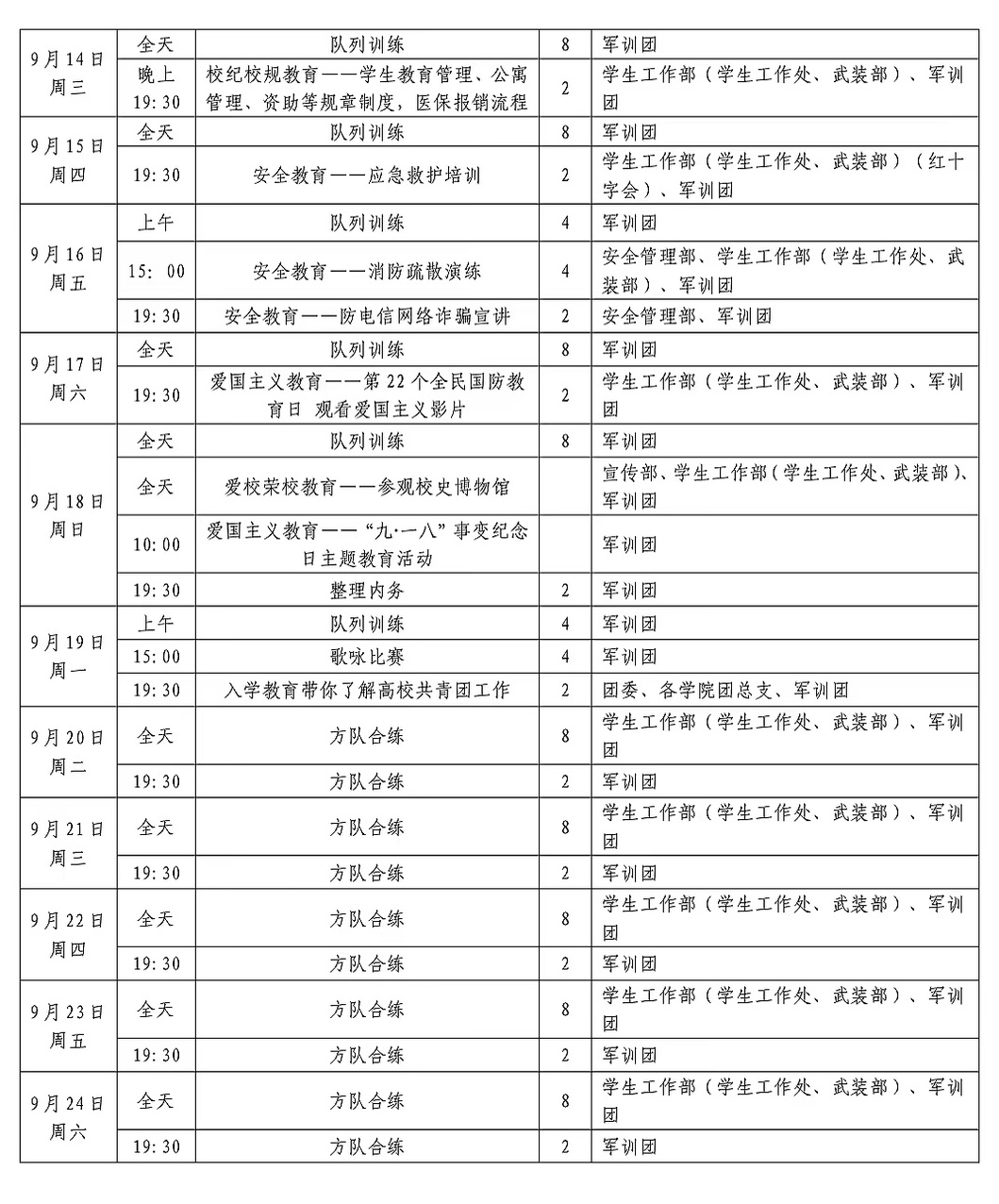 (二)依据《高等学校军事训练教学大纲》内容进行军训,训练以室外为主,重点突出队列动作、纪律作风、消防知识、危机逃生、内务卫生及规范的作息制度等科目的训练教育。