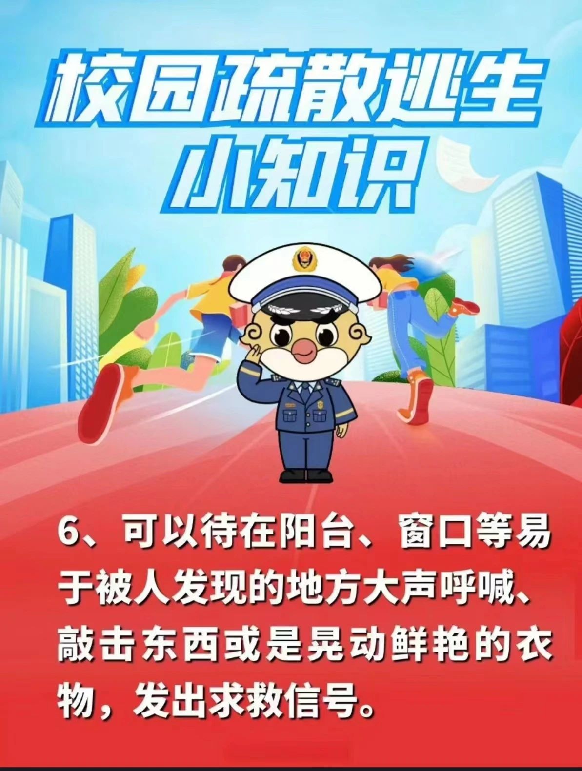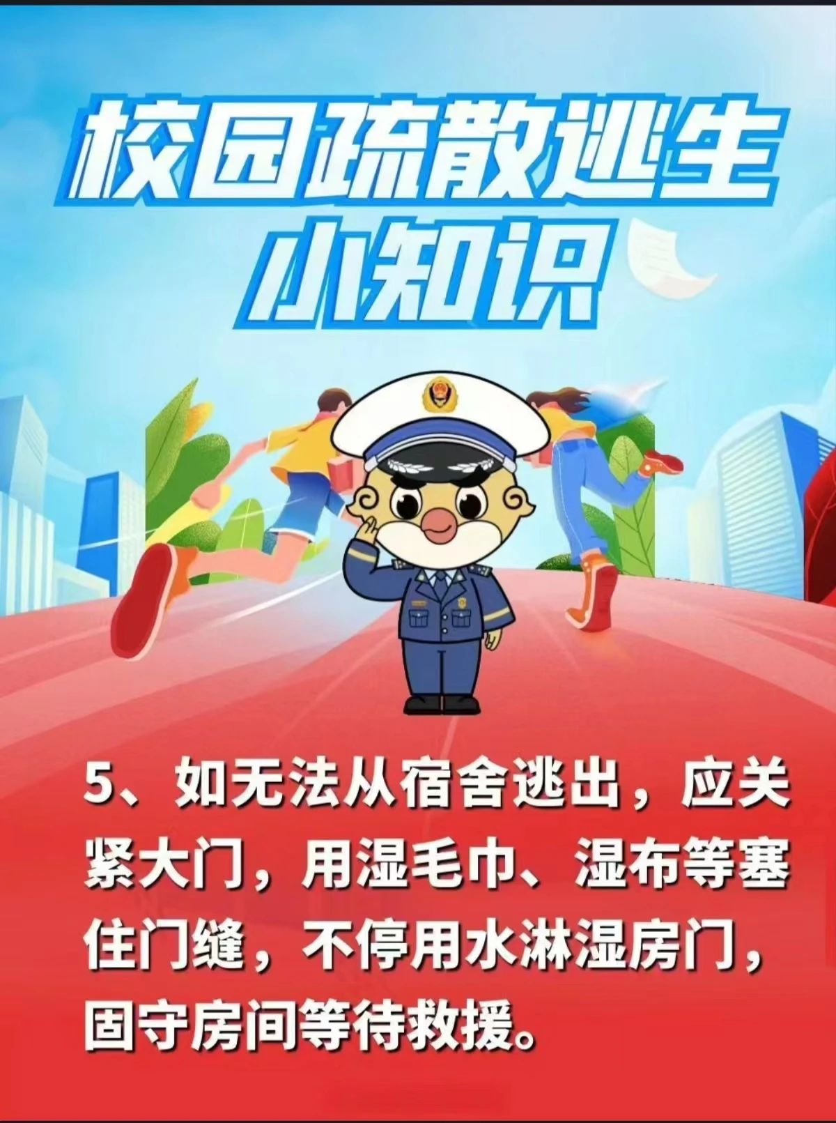 当屋外起火时,切勿随意开门,应用手背试门把手温度。若门把手温度很高或有浓烟从门缝中往里钻,此时切不可打开房门,应退守房间,做好防护,有条件可向门上浇水,用浸湿衣物床单等堵住门缝,并在易被人发现的地方挥动鲜艳衣物或用手电发出求救信号,在没有安全保障情况下切勿盲目跳楼逃生。此方法同样适用于烟雾大、逃生通道被阻隔时。