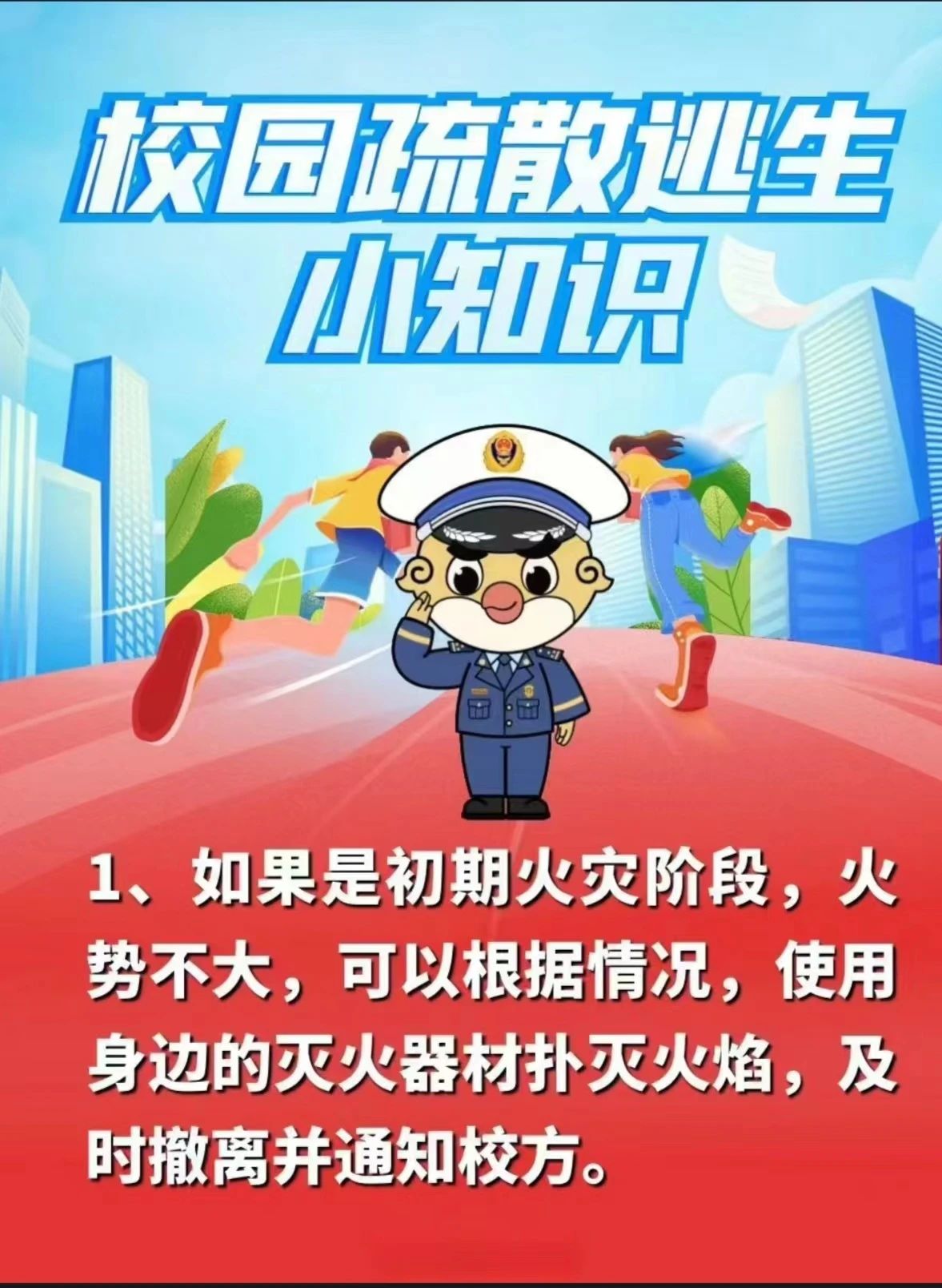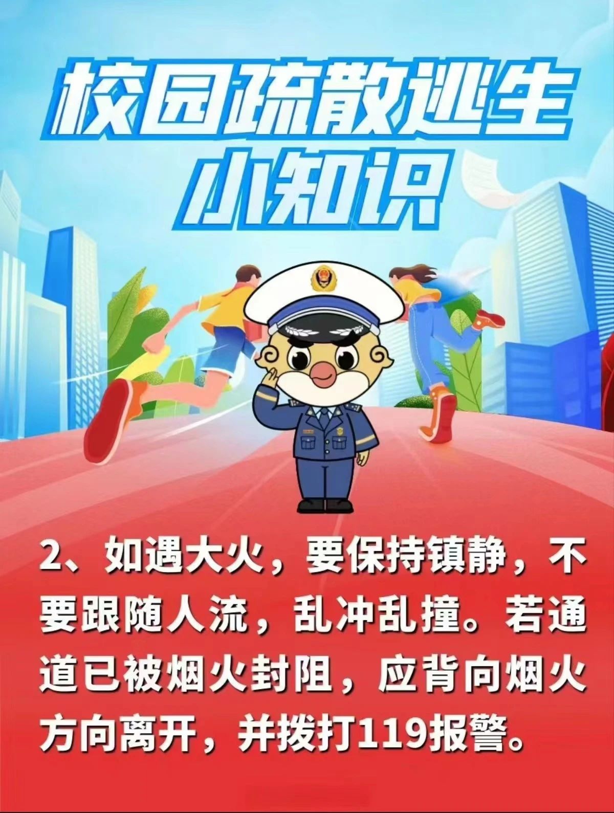 ①如果着火点位于自己所处位置的上层,此时应走安全通道向楼下逃去,直至到达安全地点。