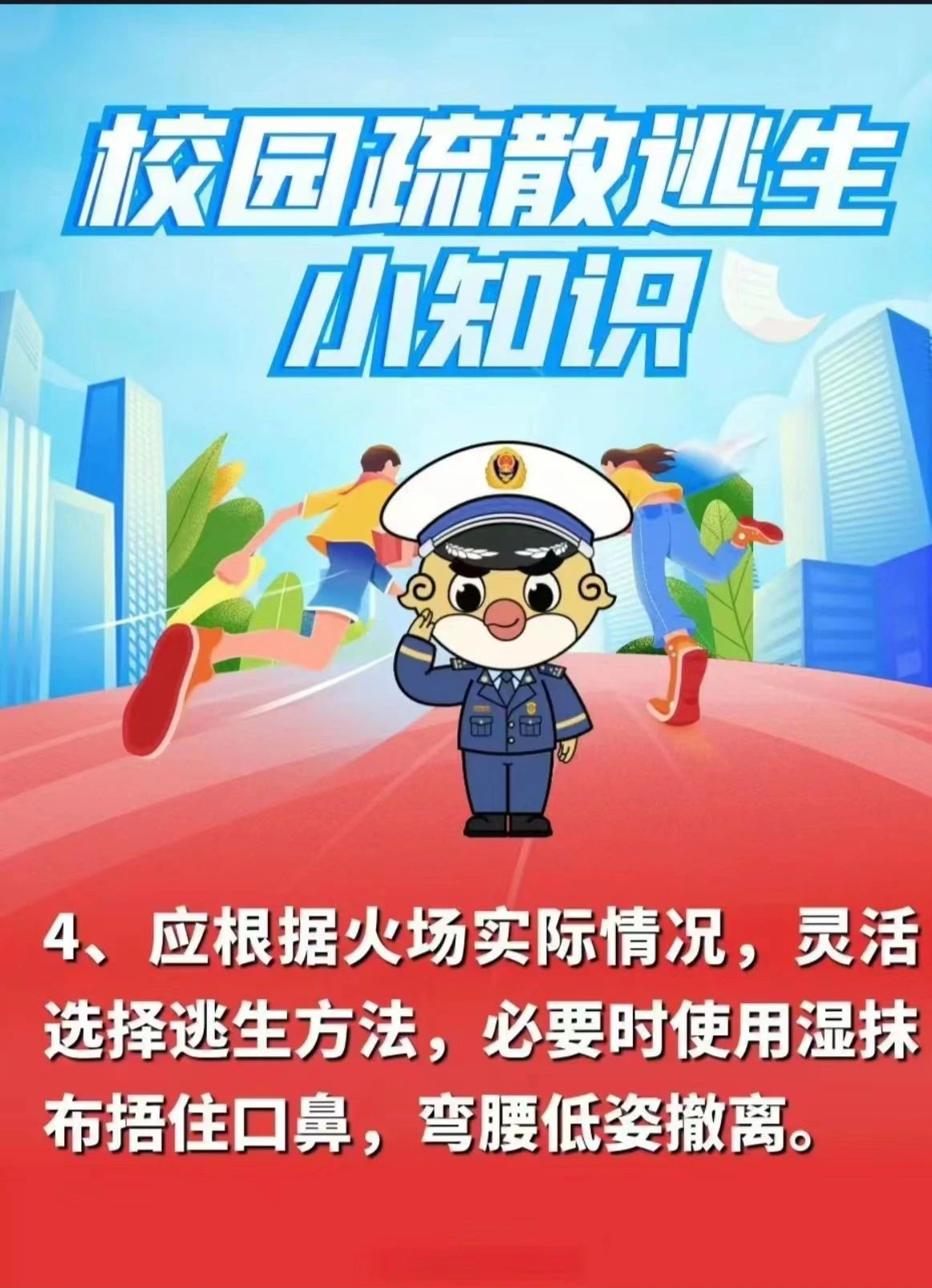 ②如果着火点位于自己所处位置的下层,且大火和烟雾已封锁向下逃生的通道,应尽快往楼上天台或避难层逃生。