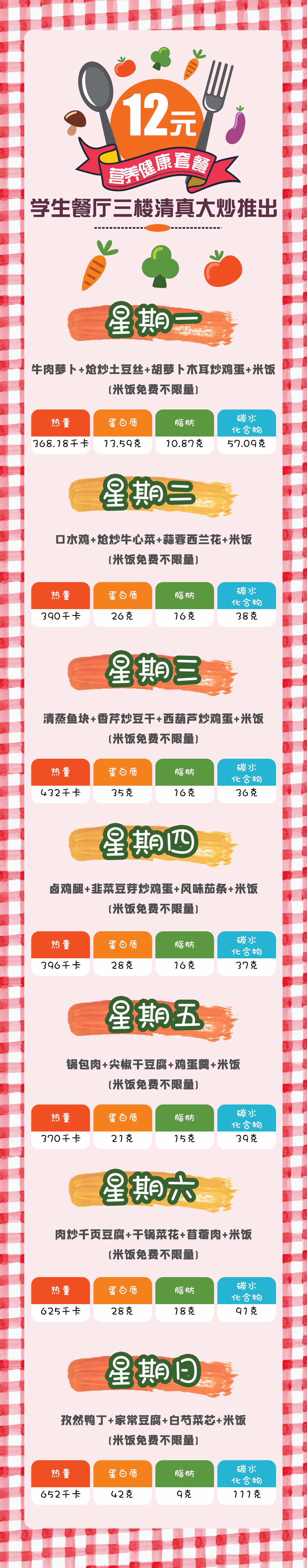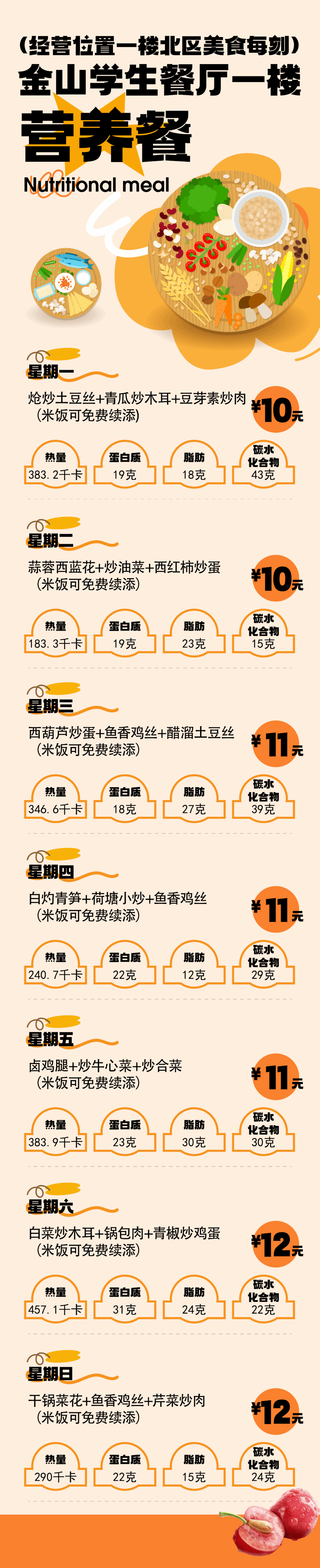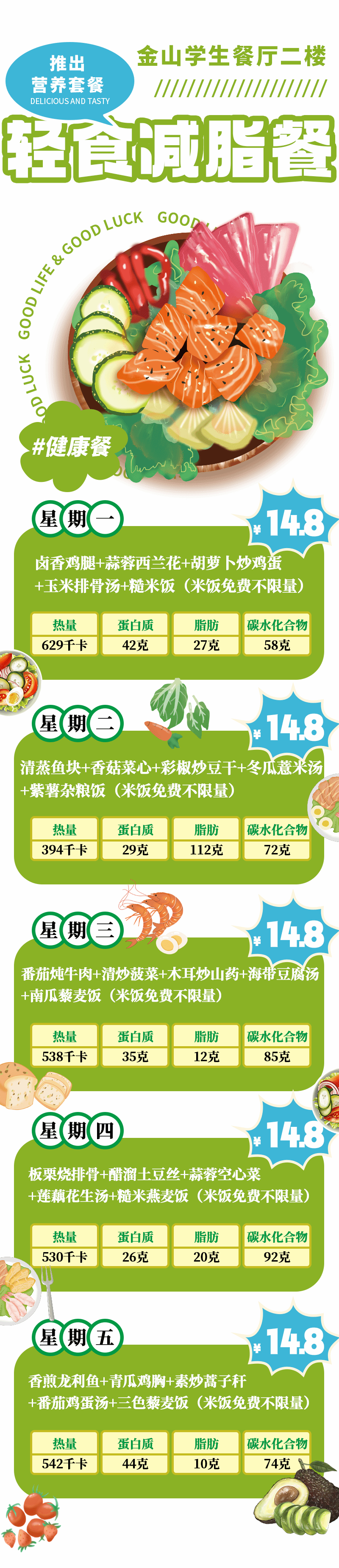为扎实推进“体重管理年”行动落实,倡导文明健康生活方式,按照国家卫生健康委发布《体重管理指导原则(2024年版)》主要精神,结合三月份学生餐厅满意度调查表中同学们所提到的关于菜品营养、健康饮食的意见,金山校区学生餐厅特别推出了精心设计的营养餐,旨在为同学们提供更加均衡和丰富的饮食选择。