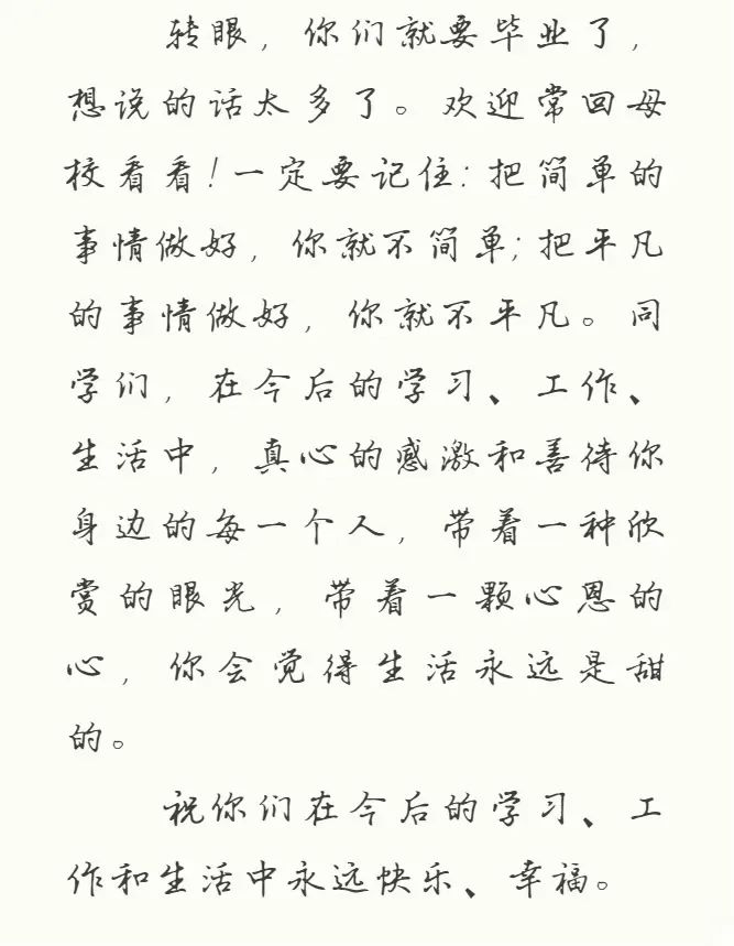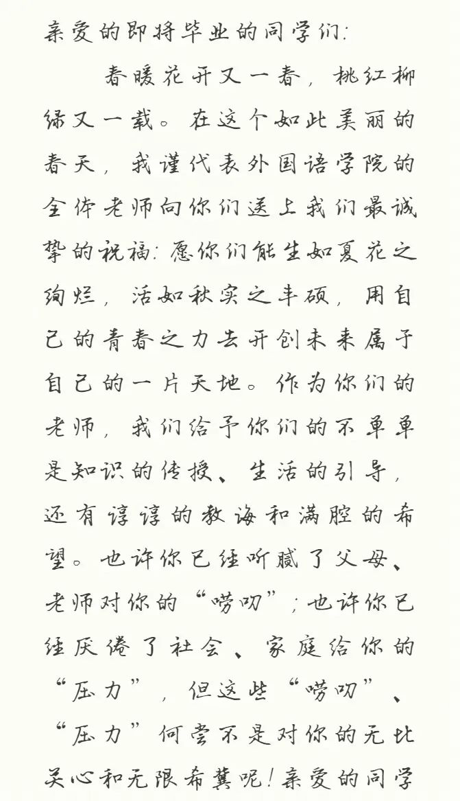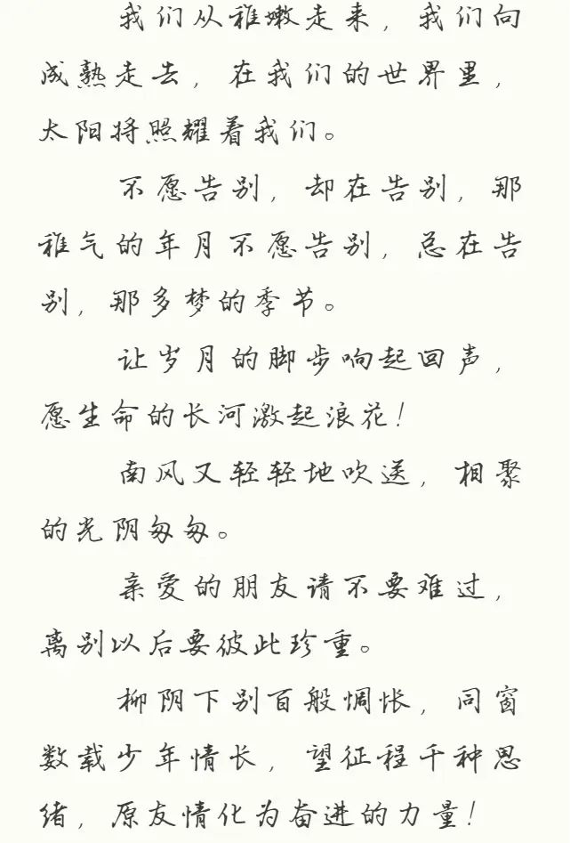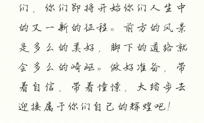 “毕业是一切都并非结束的郑重开始,毕业是一切都没有飘散的深沉铭刻。因为校园是历久弥新的青春扉页,因为社会是背景壮阔的人生大学。 ——赵显周《大学》