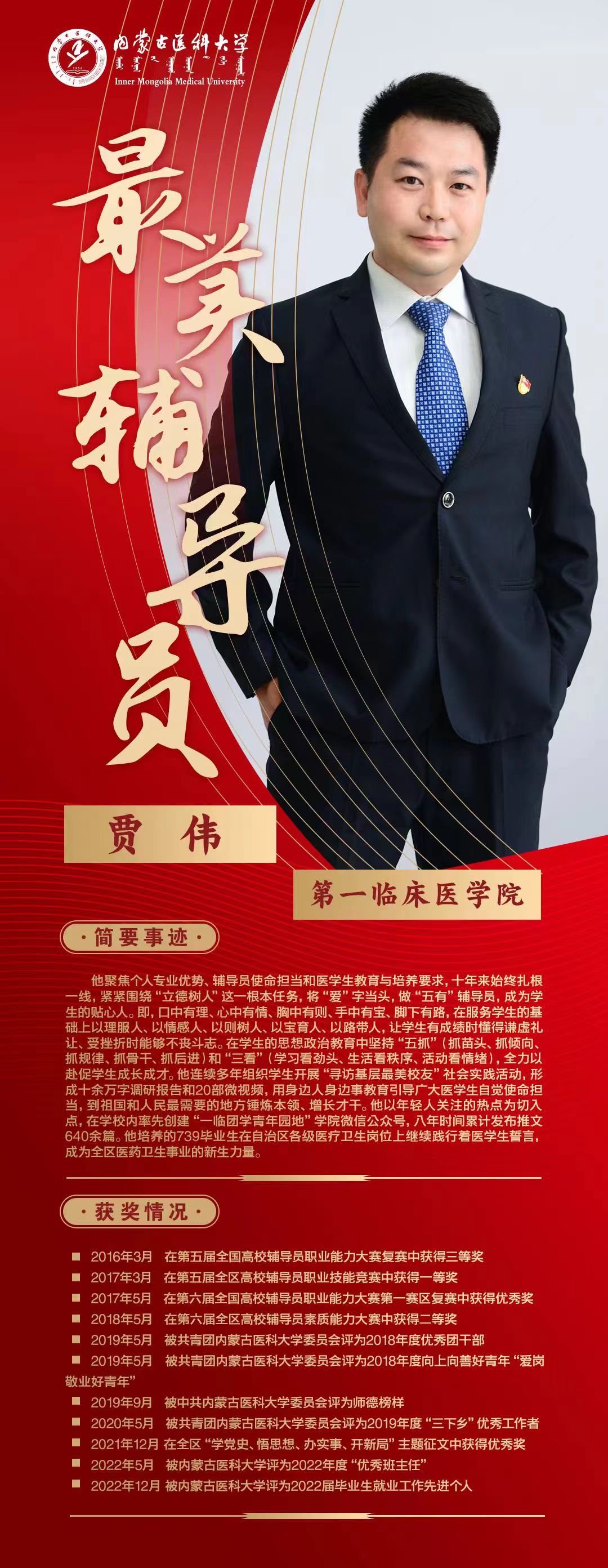 贾伟把立德树人作为教育的根本任务,多次被评为内蒙古医科大学优秀辅导员、优秀团干部和大学生“三下乡”社会实践优秀工作者;他情系学子,用爱浸润学生成长之路,曾获得第五届金国高校辅导员职业能力大赛复赛三等奖、第五届金区高校辅导员职业枝能竞赛一等奖,在历届内蒙古医科大学辅导员素质能力大赛中共荣获一等奖三次、单项奖七次;他言传身教,以身作则,被学校评为向上向善好青年之“爱岗敬业好青年”和师德榜样。