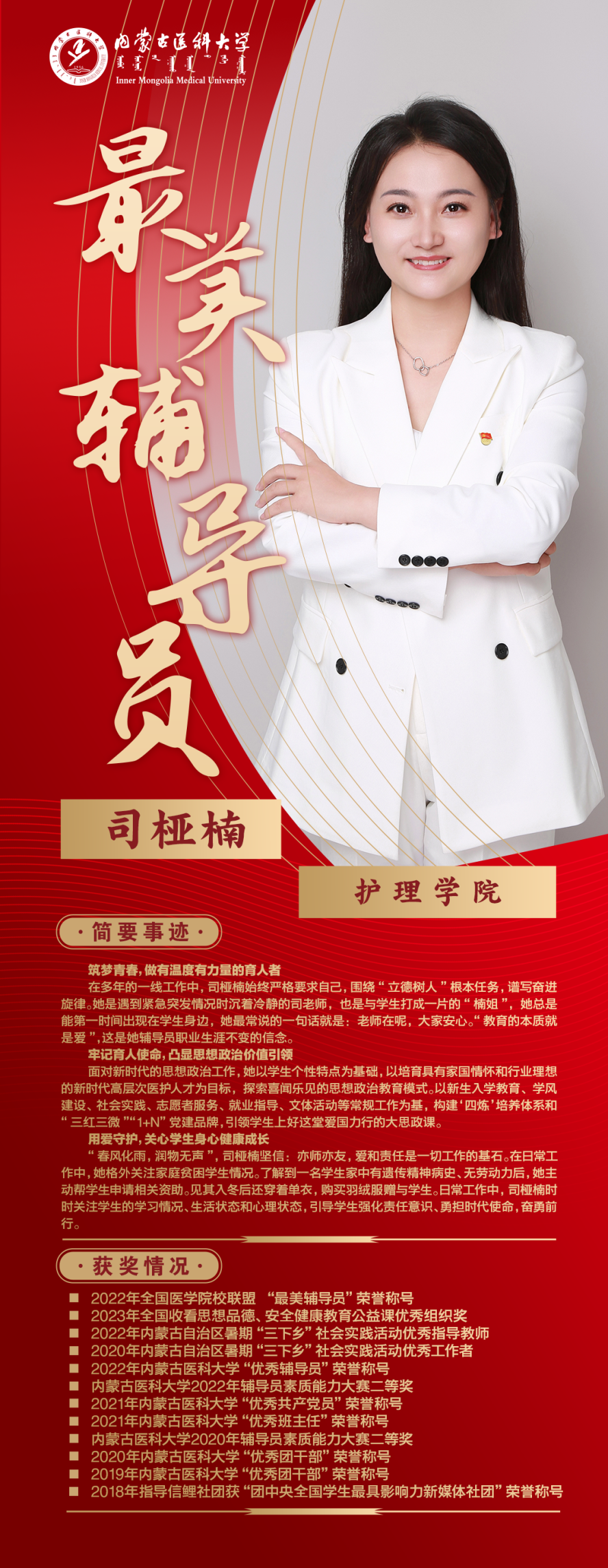 作为“为党育人,为国育才”的新时代高校辅导员,司桠楠在用理论指导实际工作的过程中,紧跟时代步伐,把握学生成长规律,以满腔热忱投入青年学生的成长和发展中,不断拓展认识的广度和深度,严格要求自己,不断提升自身辅导员能力素质。荣获2022年全国医学院校联盟“最美辅导员”荣誉称号、2023年全国收看思想品德、安全健康教育公益课优秀组织奖、2022年内蒙古自治区暑期“三下乡”社会实践活动优秀指导教师、2022年内蒙古医科大学“优秀辅导员”荣誉称号、2022年内蒙古医科大学辅导员素质能力大赛二等奖、2021年内蒙古医科大学“优秀共产党员”荣誉称号、2021年内蒙古医科大学辅导员素质能力大赛二等奖、2021年内蒙古医科大学“优秀班主任”荣誉称号、2020年内蒙古自治区暑期“三下乡”社会实践活动优秀工作者、2020年内蒙古医科大学“优秀团干部”荣誉称号、2019年内蒙古医科大学“优秀团干部”荣誉称号。2023年牵头成立“杏暖医护”辅导员工作室。