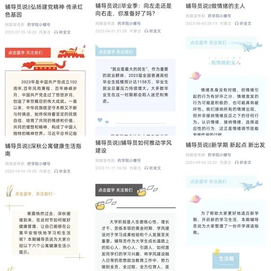 “立心铸魂”辅导员工作室以建设有思政热度、有时代温度的新媒体平台,有特色品牌、有育人实效的思政引领队伍为发展目标,利用专兼职辅导员的所学专业特点和业务素养优势,推出“青春引路人 辅导员微讲堂”精品项目。项目涵盖网络育人阵地“药学院小螺号——辅导员说”和线下实践教育“辅导员微讲堂——线下系列讲座”两条育人通道,每月面向全体学生推出不同主题的网络推文和专题讲座,以立德树人为根本、立心铸魂为核心,双管齐下帮助学生全方位提高学习能力和学业水平,引导学生在夯实专业知识的同时塑造健康积极的人生态度,在青春的赛道上奋力奔跑,争取跑出当代青年的最好成绩。
