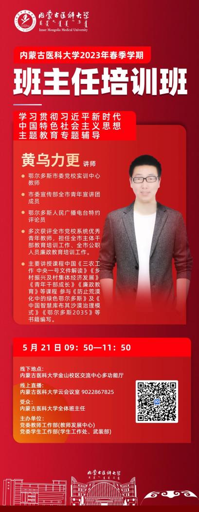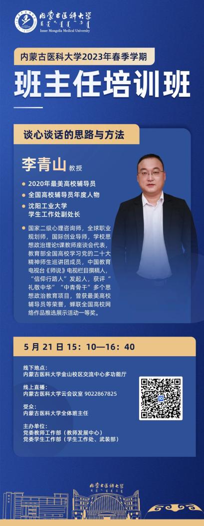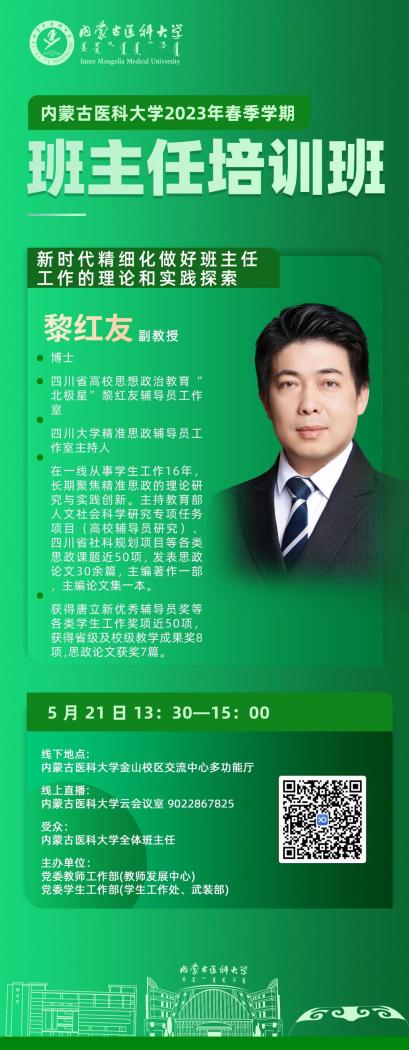5月21日,内蒙古医科大学2023年春季学期班主任培训班在交流中心多功能厅以线上线下相结合的方式举办,学校党委委员、副校长鲁海文出席会议并讲话。党委教师工作部(教师发展中心)部长(主任)王进文、学生工作部(学生工作处、武装部)全体教师、各学院学生工作分管领导、全体班主任、辅导员等390人参加了此次培训。开班式由党委学生工作部(学生工作处、武装部)部长(处长、部长)苏雅拉图主持。本次培训2场讲座面向全区高校进行直播,讲座观看直播人数达到2000余人。