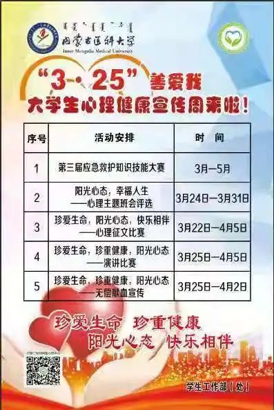 “3・25”谐音“善爱我”,倡导大学生善待自我、关爱自我、健康成长,并以发自内心的爱与和谐来善待、关爱他人与社会。今年“3・25”心理健康宣传周以“珍爱生命,珍重健康,阳光心态,快乐相伴”为主题,着力培育学生自尊自信、理性平和、积极向上的健康心态,促进学生心理健康素质与思想道德素质、科学文化素质协调发展。