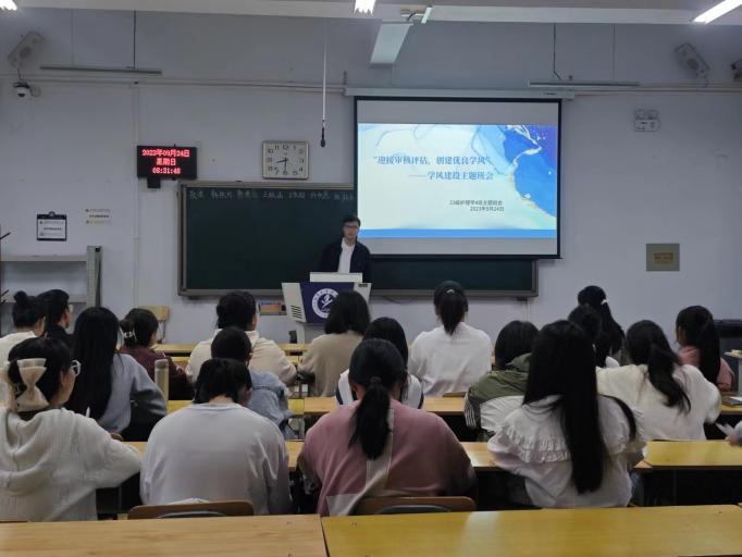 我校多个学院开展了“迎接审核评估,创建优良学风”的学风建设主题班会。其中,中医学院2020级中医二班师生共同学习了审核评估学生应知应会、了解学校校史、理解立德树人、三全育人的内涵等,使同学们对于审核评估相关思想认识更加深刻;卫生管理学院多个班级通过班主任细致讲解和提问,学生积极回答并发表学习感言的方式学习审核评估相关知识,以实际行动为迎评促建助力。