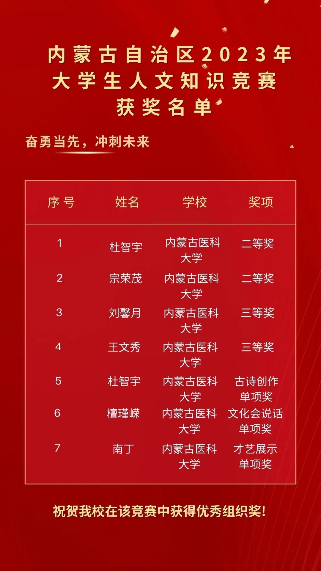 经领导统筹部署、指导老师精心辅导、选手激烈角逐、评委网络评审、承办方官网公示,我校学生在17所高校161名选手参加的2023年内蒙古自治区大学生人文知识竞赛决赛中荣获二等奖2项,三等奖2项,“古诗创作”单项奖1项,“文化会说话”单项奖1项,“才艺展示”单项奖1项。内蒙古医科大学获优秀组织奖。其中1名选手推荐参加华北五省区决赛。