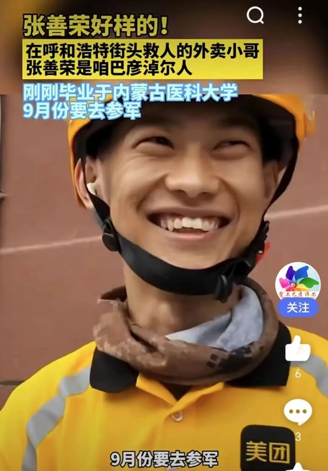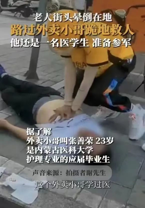 “我今年刚刚从内蒙古医科大学护理专业毕业,9月要去参军,趁这个空档期做外卖员。我学医4年,也在急诊科待过,当时看到伤者后,摸了摸他的颈动脉,看看有没有呼吸,因为担心他窒息,就帮他清理了一下口腔异物,开始做心肺复苏和人工呼吸。人工呼吸的时候发现口腔里还有异物,正要继续清理的时候救护车就赶到了,我也就离开了。”张善荣表示,他当时没想太多,就想着把人救过来。他说:“现场好心人特别多,路人主动帮忙打了120急救电话,清理口腔异物的时候有路人递来了纸巾。我也是正好赶上了,希望那位受伤的老人能够安然无恙。”