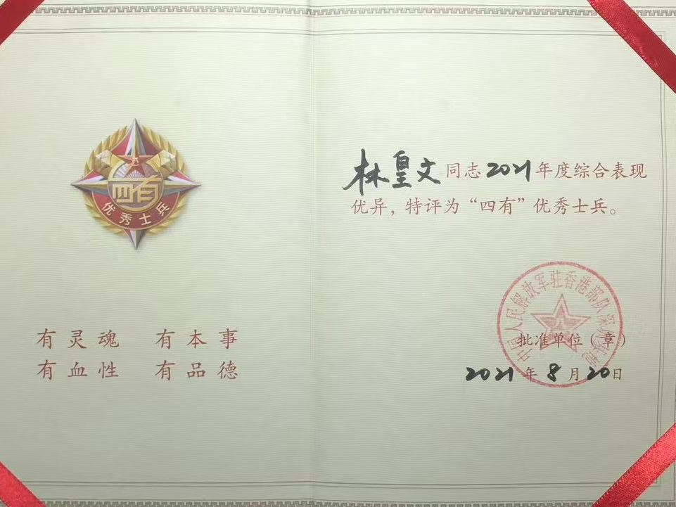 参军期间,他被授予“优秀军人”的荣誉称号并获得“嘉奖”一次。林皇文记得,2021年春节的深夜,手握钢枪站岗,望着明月,他就在想: 这一刻,在这960万平方公里的土地上,在这万家团圆的日子里,有无数个像他一样的中国军人在默默的守护着国家的和平,守护着人民的美好生活。