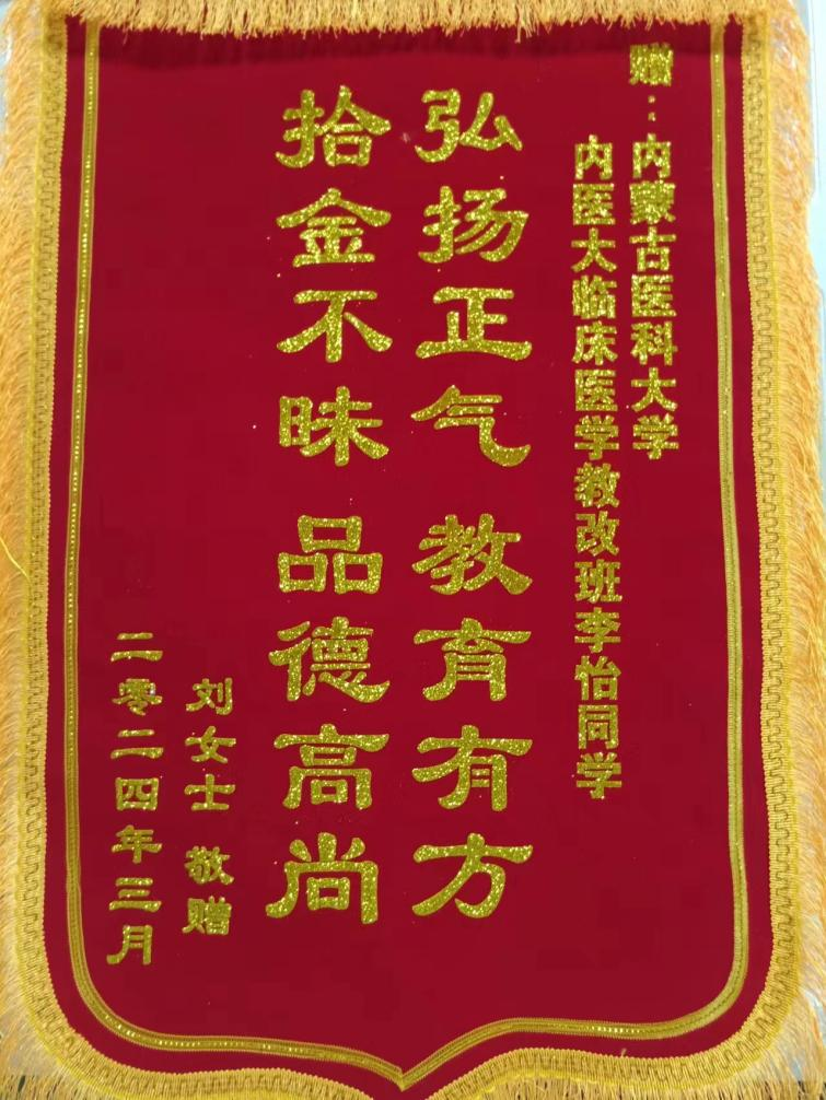 今年2月,李怡同学在呼和浩特体育场地铁站内捡到一个装有三万元现金的黑色皮包,她立即将皮包交给地铁站工作人员,并在站内耐心等待,直到失主亲自取回皮包。失主刘女士当即拿出部分现金表示感谢,被李怡同学婉言谢绝。刘女士十分感动,对我校培养出具有良好品格的学生表示敬意,特地为李怡同学送上锦旗和感谢信。