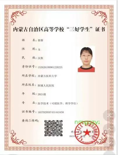 郭蓉,女,中共党员,内蒙古医科大学附属肿瘤医院2021级临床检验诊断学硕士研究生,班级团支部书记。专业能力突出,综合素质优异。入校以来,先后连续两年荣获国家奖学金、自治区三好学生、校级优秀学生等荣誉,发表国家级论文1篇,科技核心论文2篇,SCI 1篇。作为一名新时代的青年大学生,始终坚持“以青春之我,担时代之责”的理念,奋发图强,砥砺前行。
