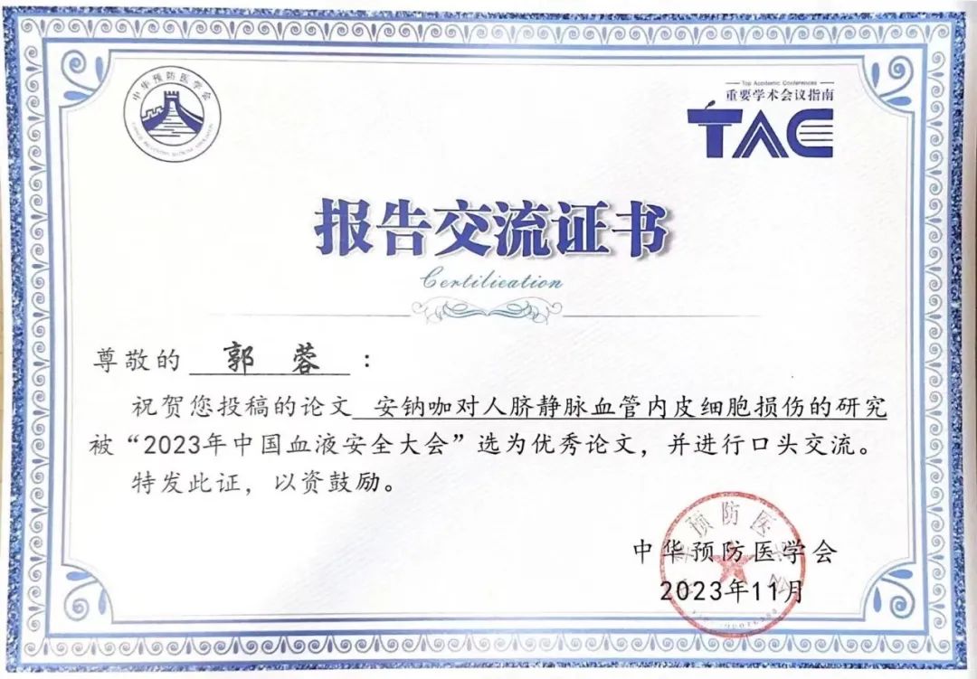 现阶段她参与了五项科研课题,以第一作者发表国家级论文1篇,科技核心论文2篇,以导师共同第一作者发表SCI 1篇。2023年11月她在导师的带领下参加了中国血液安全大会,她与卫家乐同学向大会投稿的2篇论文获得大会壁报参展,并且她获得优秀论文奖在大会作交流发言,另外1篇论文获得中国输血杂志全文刊登。郭蓉同学一直以严谨的态度做好每一件事,她经常告诫自己“不忘初心,方得始终”,时刻保持着永不服输的精神和破釜沉舟的干劲,保持着对科研的热情,在研学的道路上锻炼自己,不断朝着自己的奋斗目标前进。