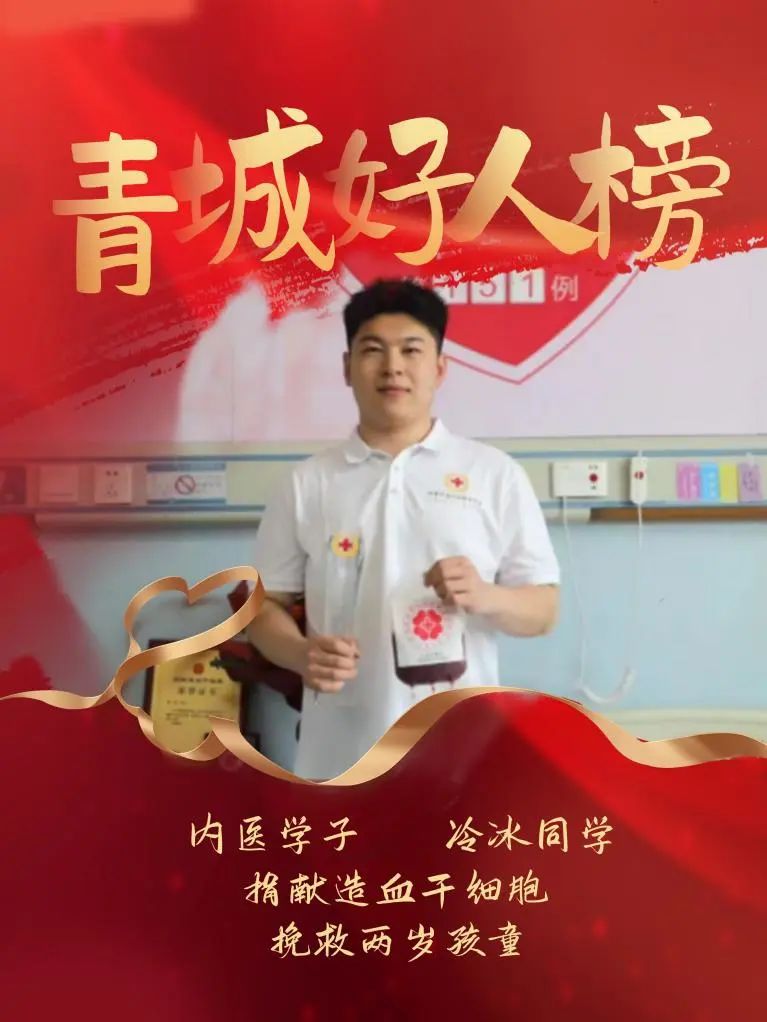 2019年6月,我校运动医学外科专业研究生冷冰在学校的流动献血车多次无偿捐献血样,并于2021年10月加入中华骨髓库,成为一名造血干细胞志愿捐献者。2022年7月,冷冰接到中华骨髓库通知,他的骨髓与一名2岁的血液病患者配型成功。据了解,非血缘关系之间的造血干细胞配型成功率只有十万分之一。他为配型积极做准备,并于2023年5月17日完成了造血干细胞的采集,成为呼和浩特市第13例、内蒙古自治区第151例造血干细胞捐献者,也是我校继包志颖同学之后的第2位造血干细胞捐献者。
