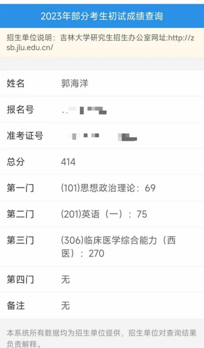 报考吉林大学第一医院心血管内科专硕,初试成绩414分,其中临床医学综合能力270分、英语75分、政治69分。